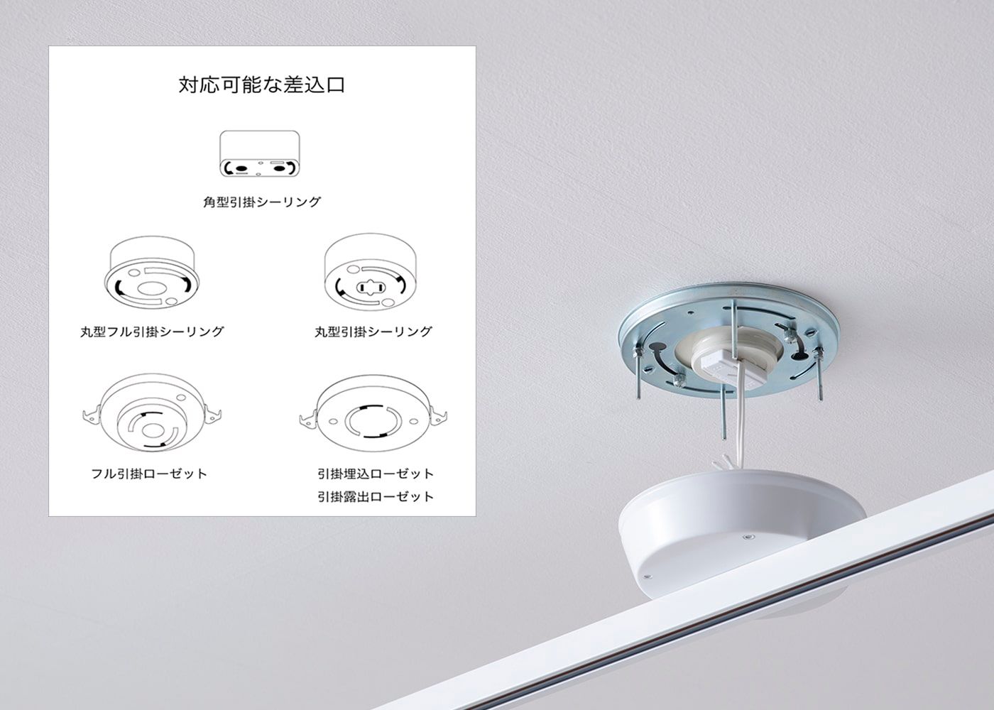 電源プラグは一般のご家庭で使われるシーリング仕様で、図のいずれかの差込口が付いていれば簡単に取り付け可能です。