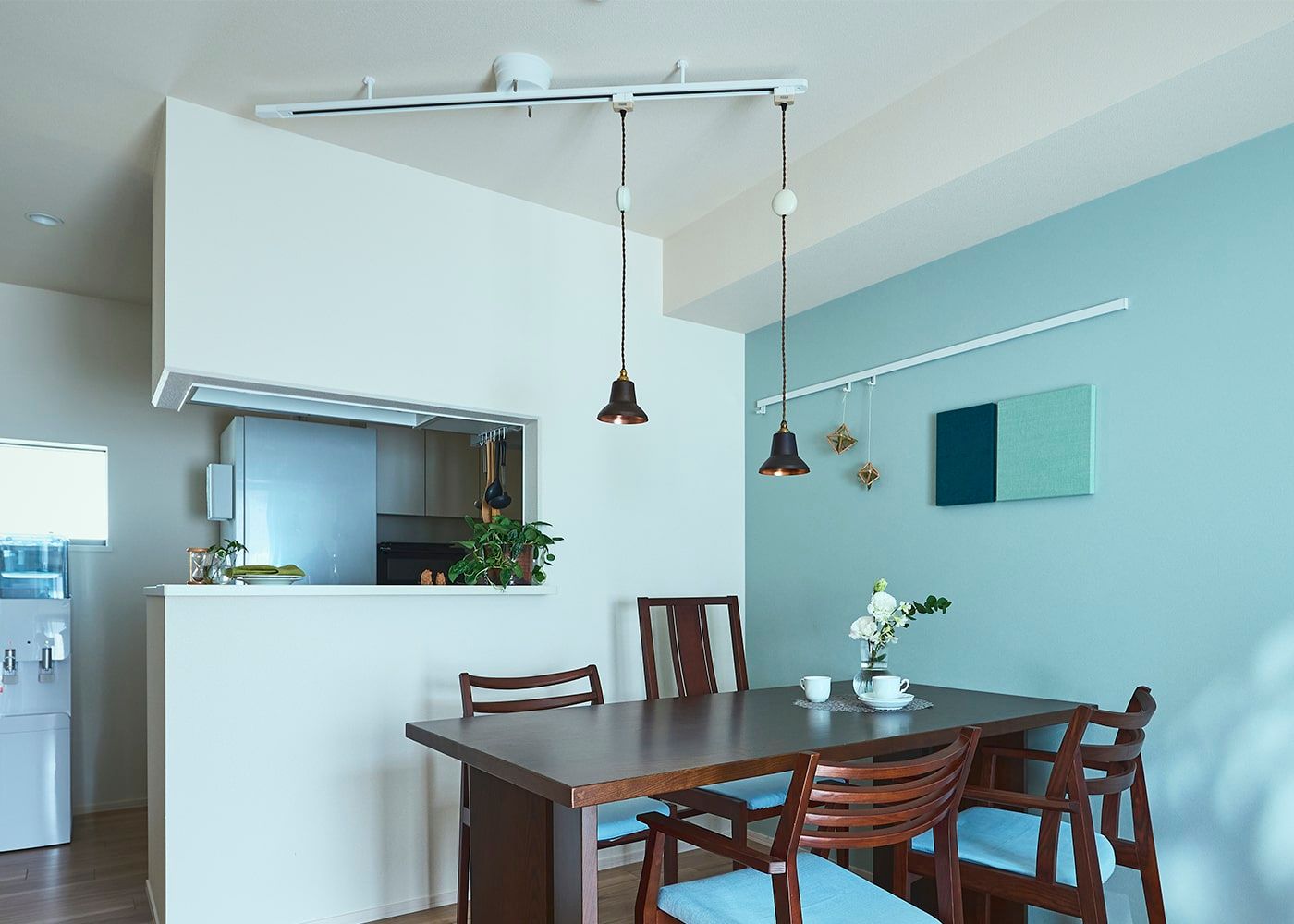 1つのシーリングにライティングレールを取り付けることで、さまざまな位置で照明を吊るすことができます。