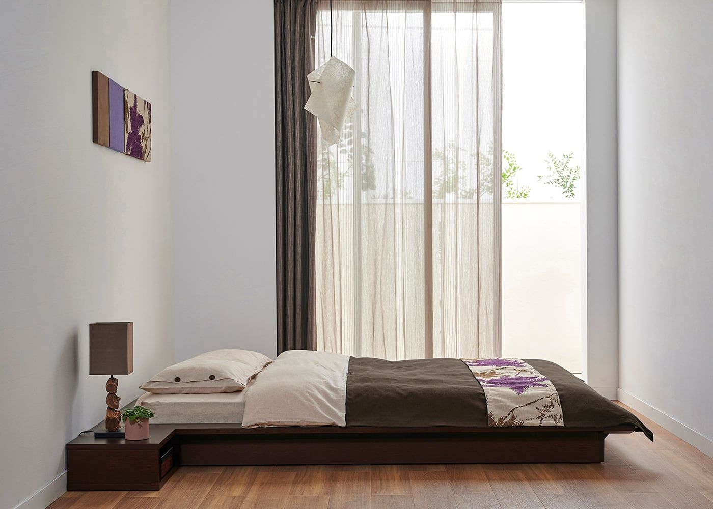 ローベッド上にコーディネートした事例。ベッドの上側にアクセントを持たせたい時にも、軽やかなデザインが活きています。適度な抜け感とまとまりのある空間で過ごしてみてください。