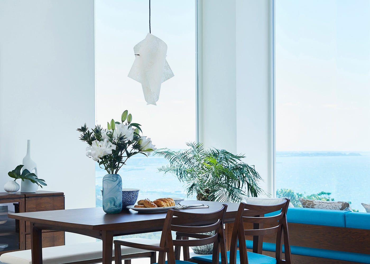 ダイニングテーブル上の食卓にも映えるtsubakuro p-1。テーブル上の空いた空間にほどよいアクセントを生み出し、普段の食卓が少し特別な時間に変わります。