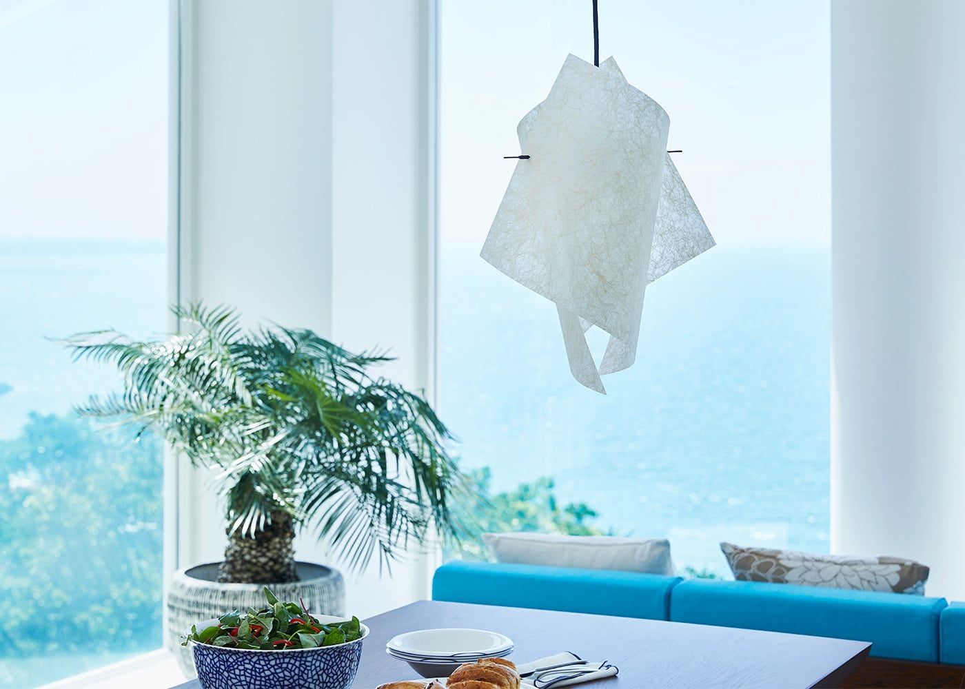 ブルーを基調とした海沿いの爽やかな空間にも、tsubakuro p-1が映えます。まるで、ツバメが空を旋回するかのような動きも感じさせる独創的な照明です。