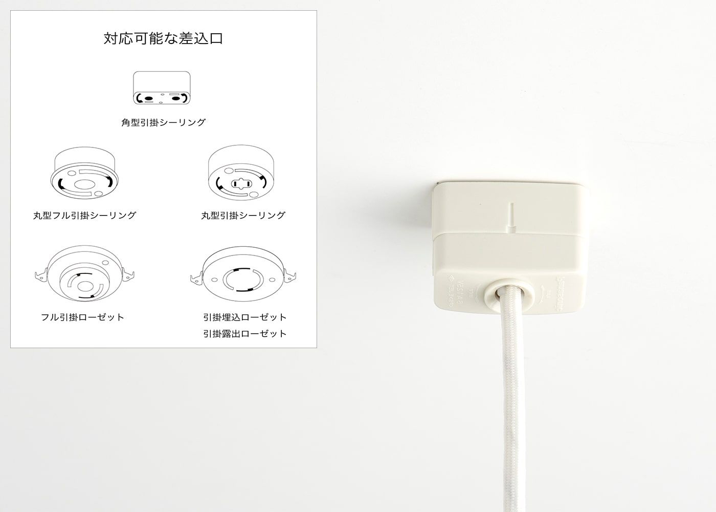 電源プラグは一般的な家庭用シーリング仕様となっており、図示されたいずれかの差込口があれば簡単に取り付けが可能です。ご自宅の形状をご確認の上、取り付けを行ってください。(別売りのシーリングカバーは