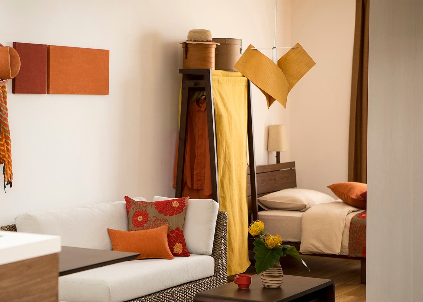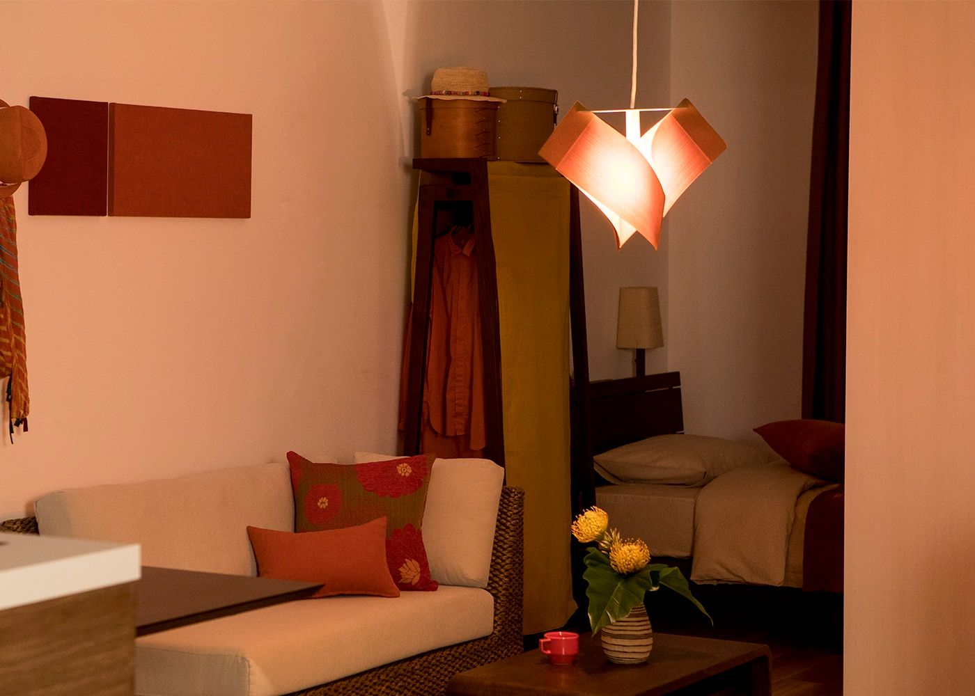 シェードの色合いと合わせて、オレンジやレッドなどの暖色系でカラーコーディネート。クッションカバーや壁面装飾との色合わせを楽しみましょう。(※この照明を使った実例は