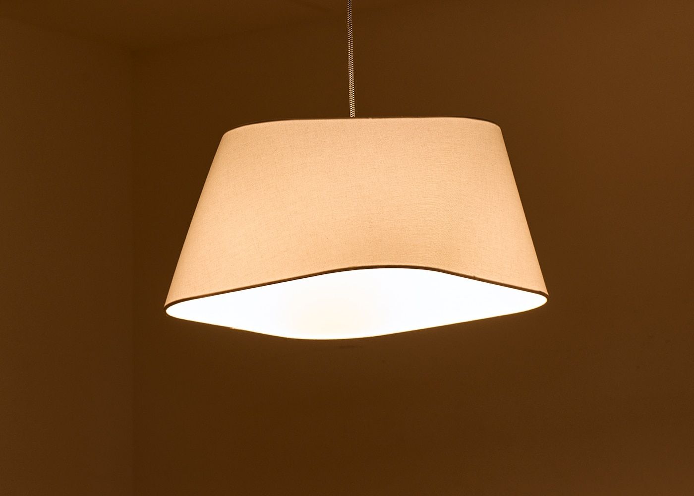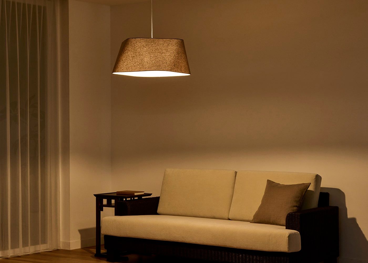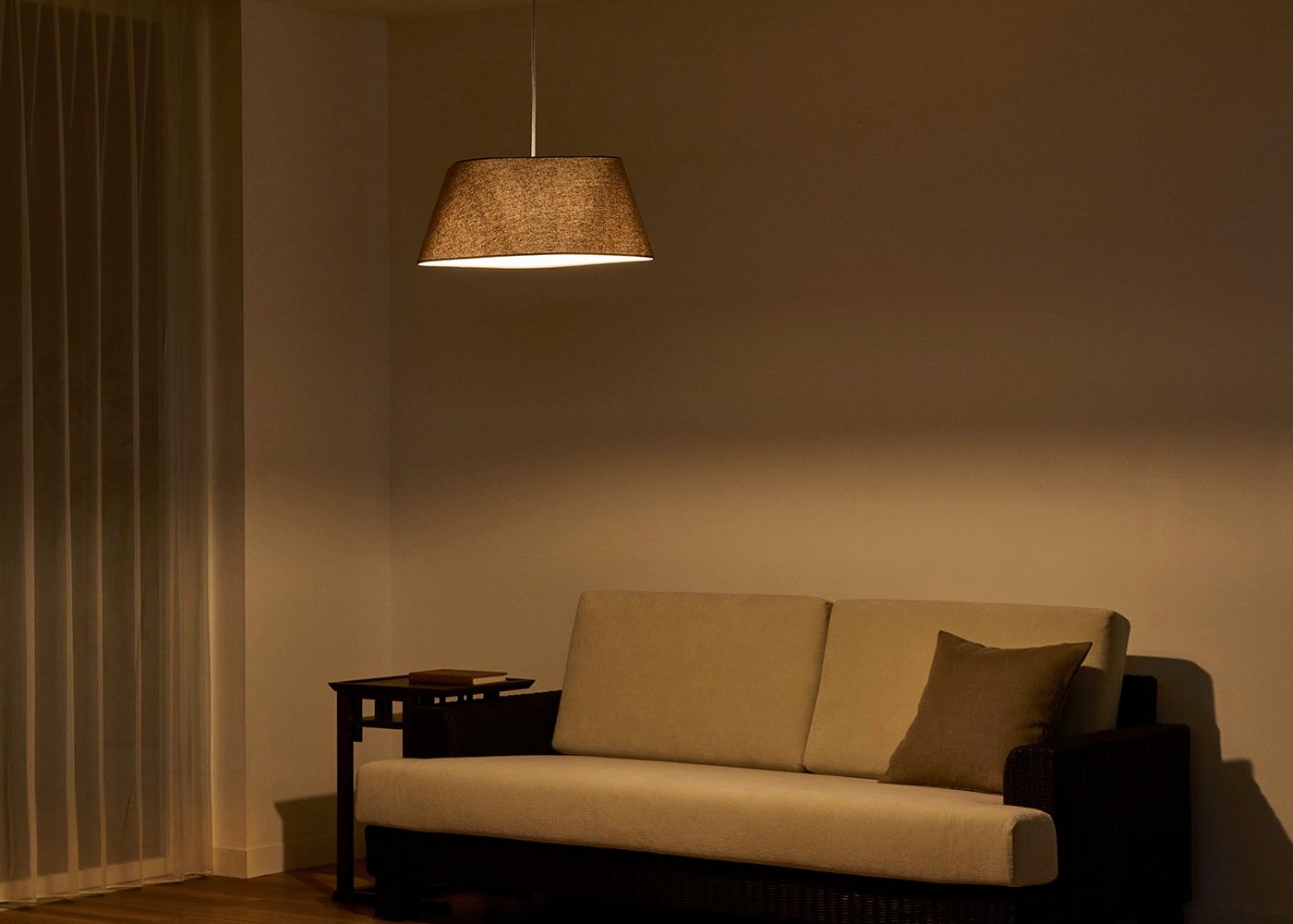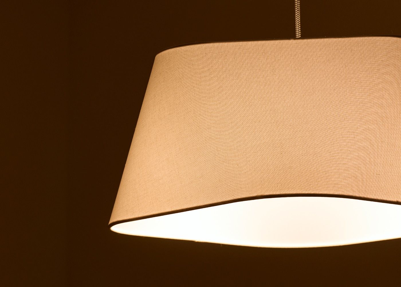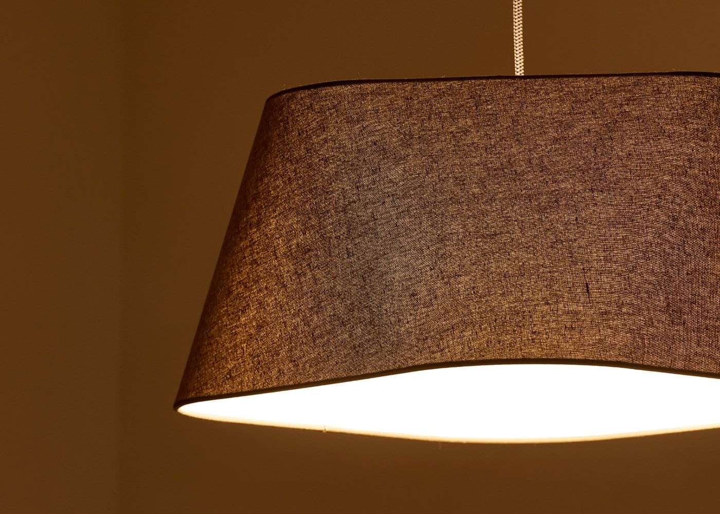 シェードのファブリックには柔らかで風合いのあるリネンコットンを使用しました。自然素材ならではの素朴な質感が空間に温かみを与え、心地よい空間を演出します。(写真はブラウン、電球OFF)