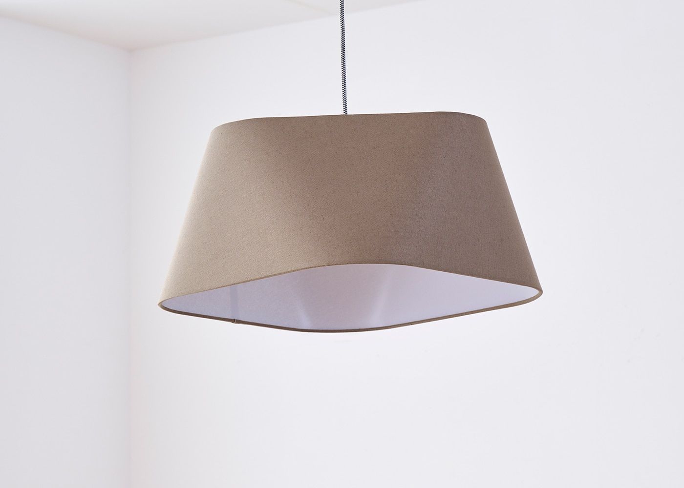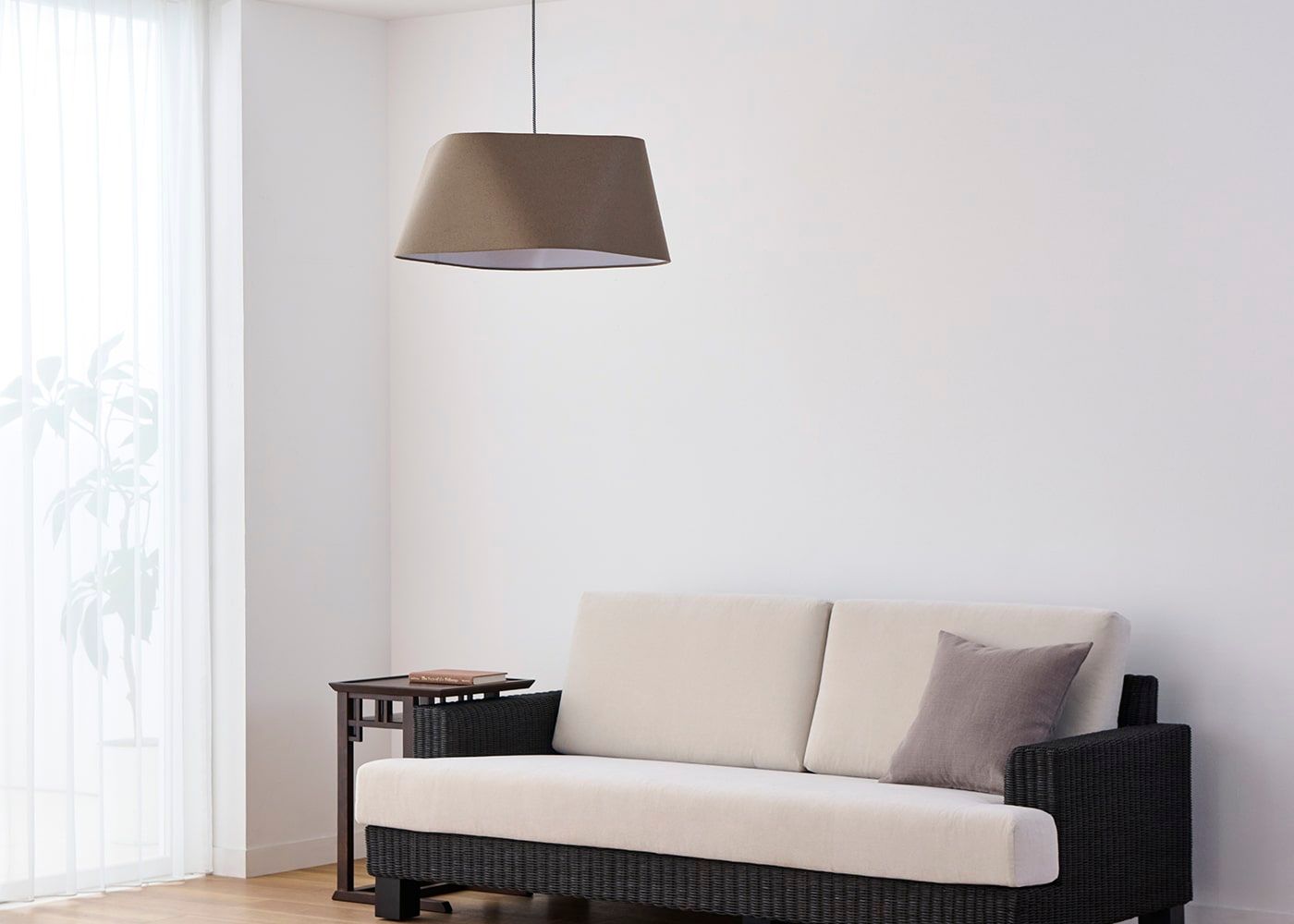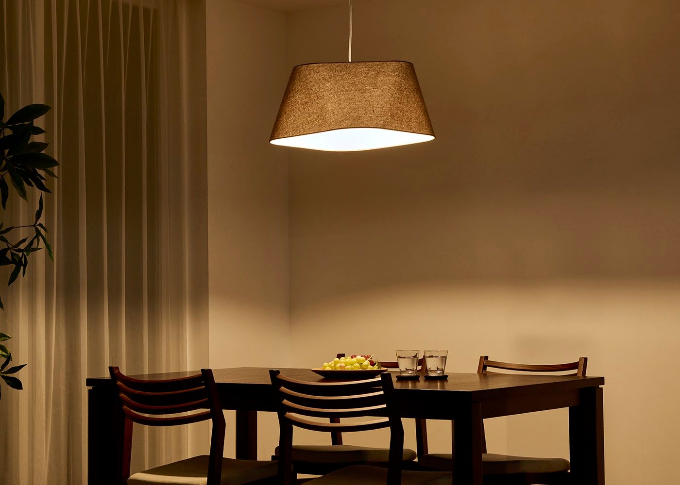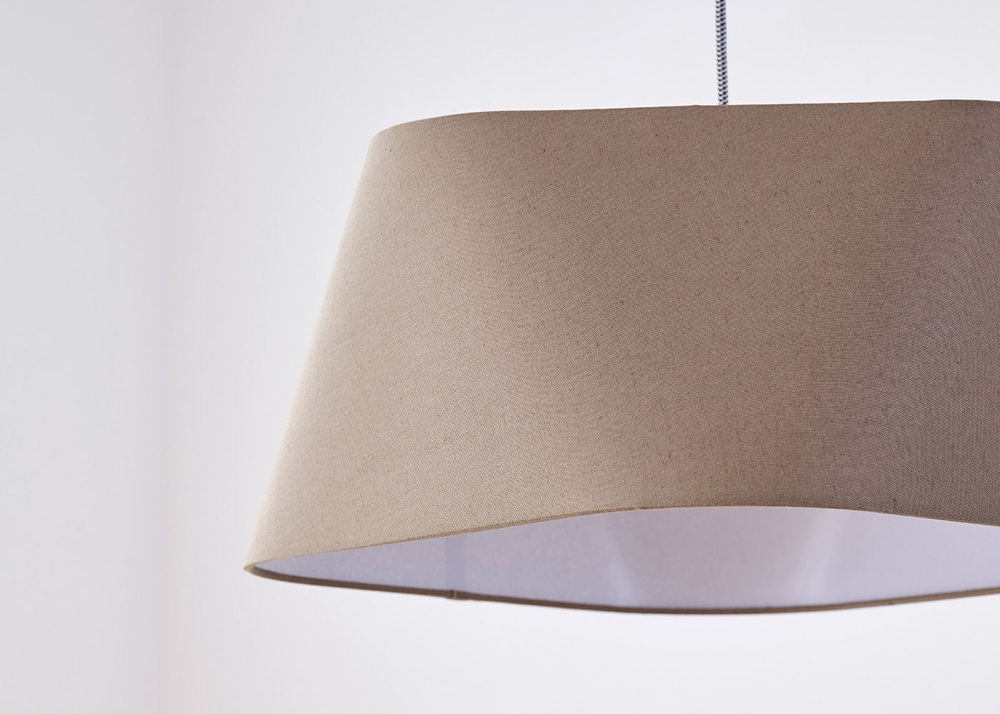 シェードのファブリックには柔らかで風合いのあるリネンコットンを使用しました。自然素材ならではの素朴な質感が空間に温かみを与え、心地よい空間を演出します。(写真はブラウン、電球OFF)