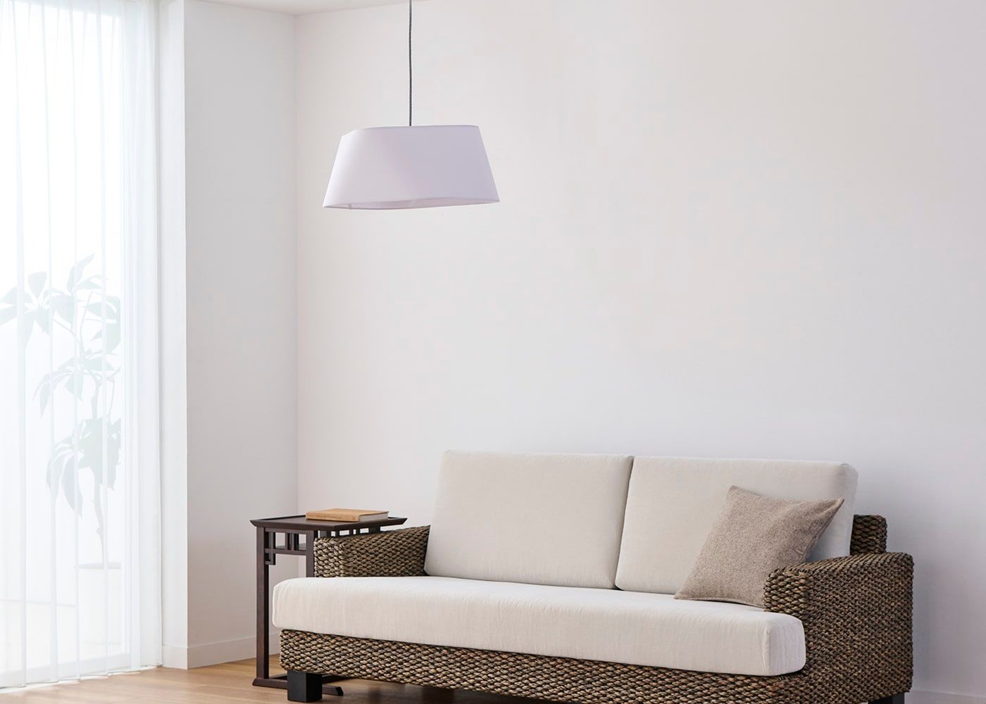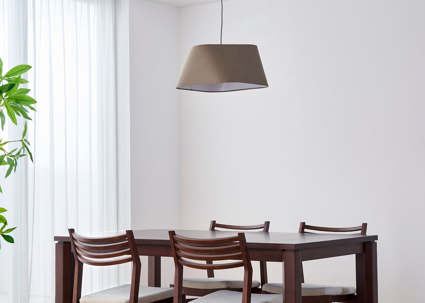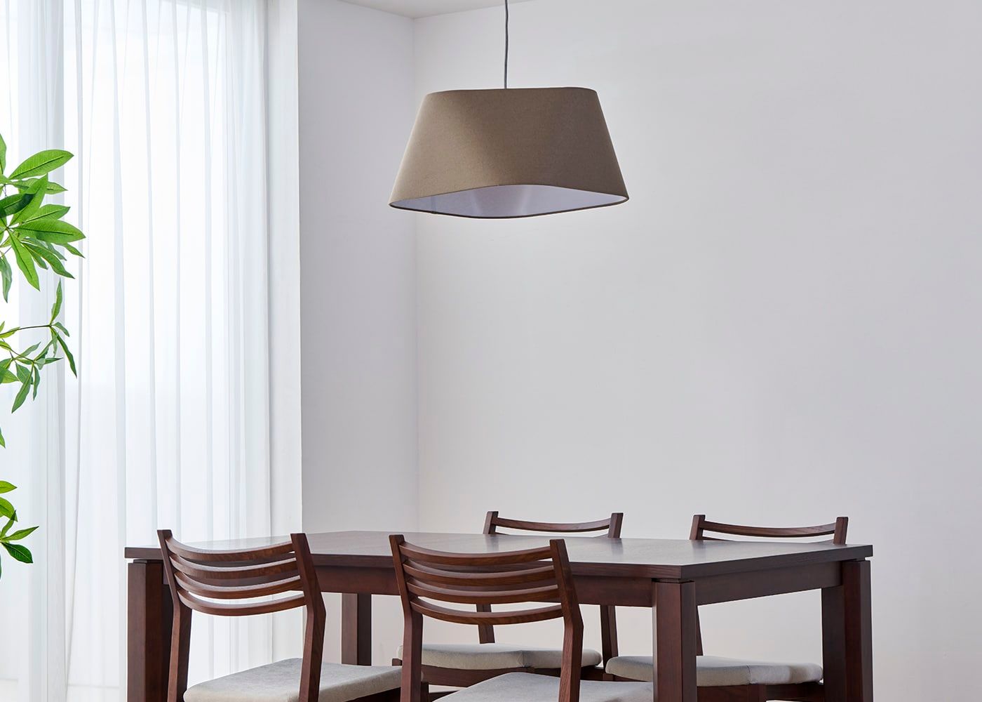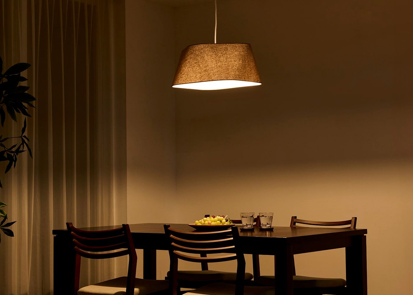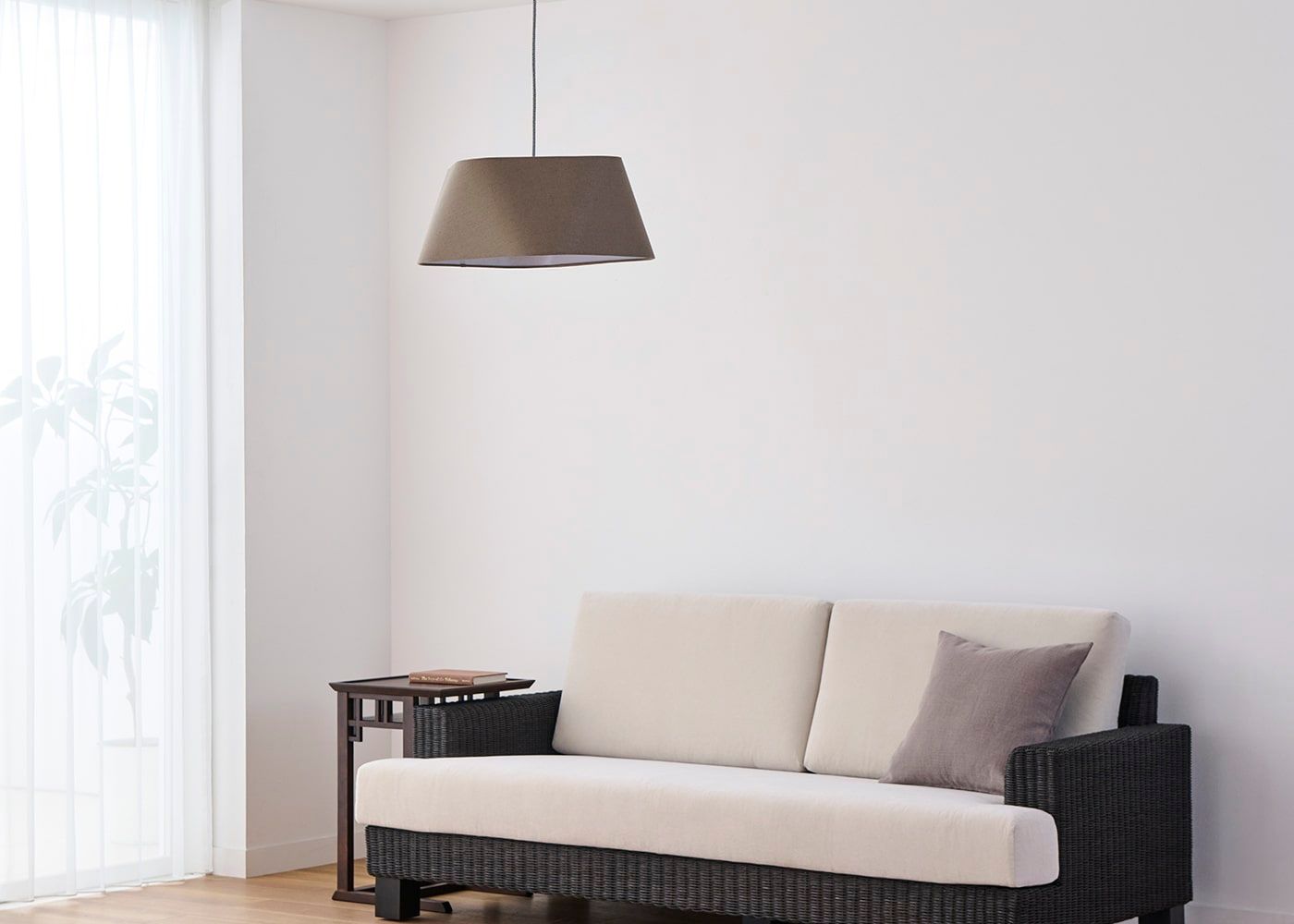 シェードのファブリックには柔らかで風合いのあるリネンコットンを使用しました。自然素材ならではの素朴な質感が空間に温かみを与え、心地よい空間を演出します。(写真はブラウン、電球OFF)