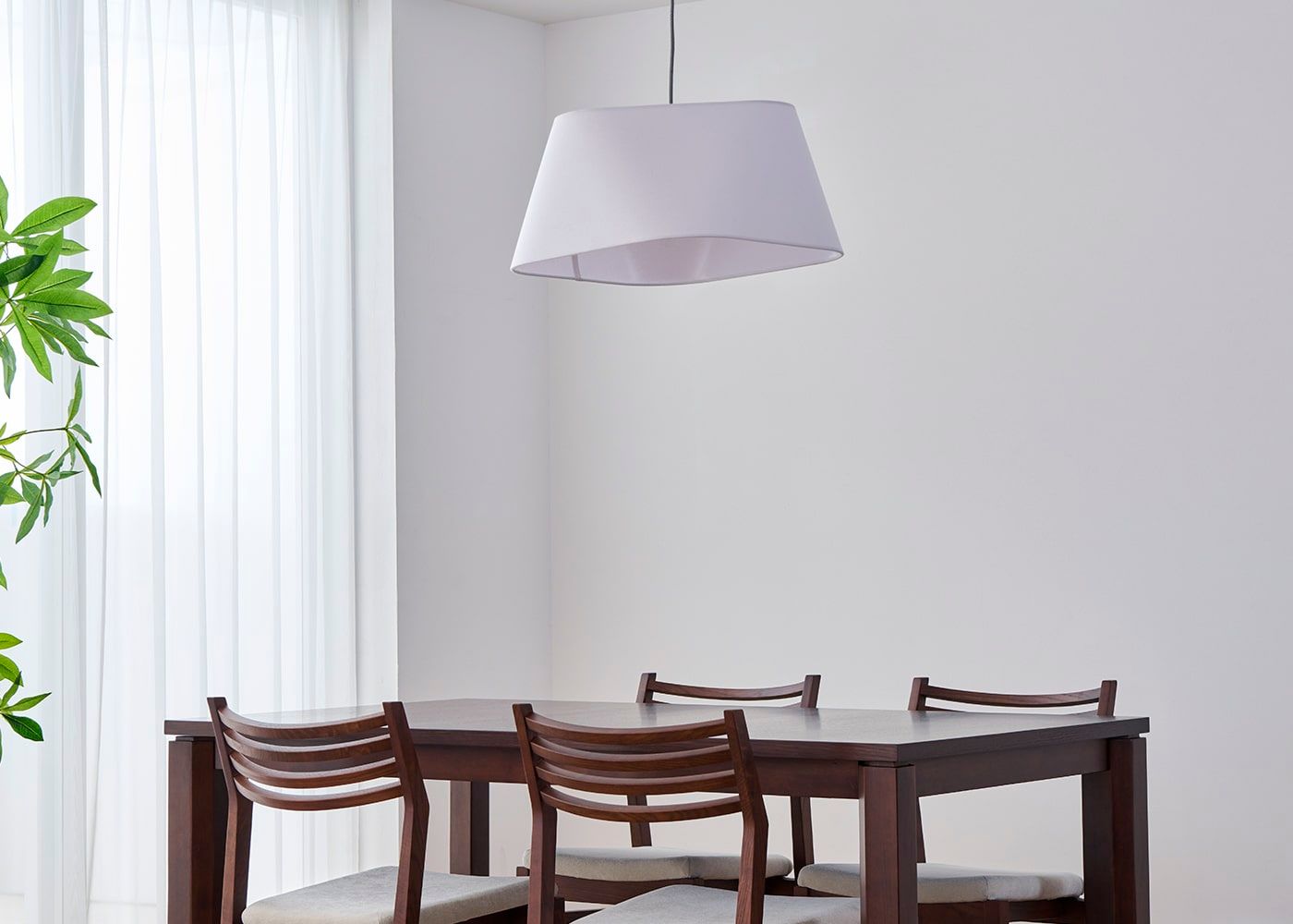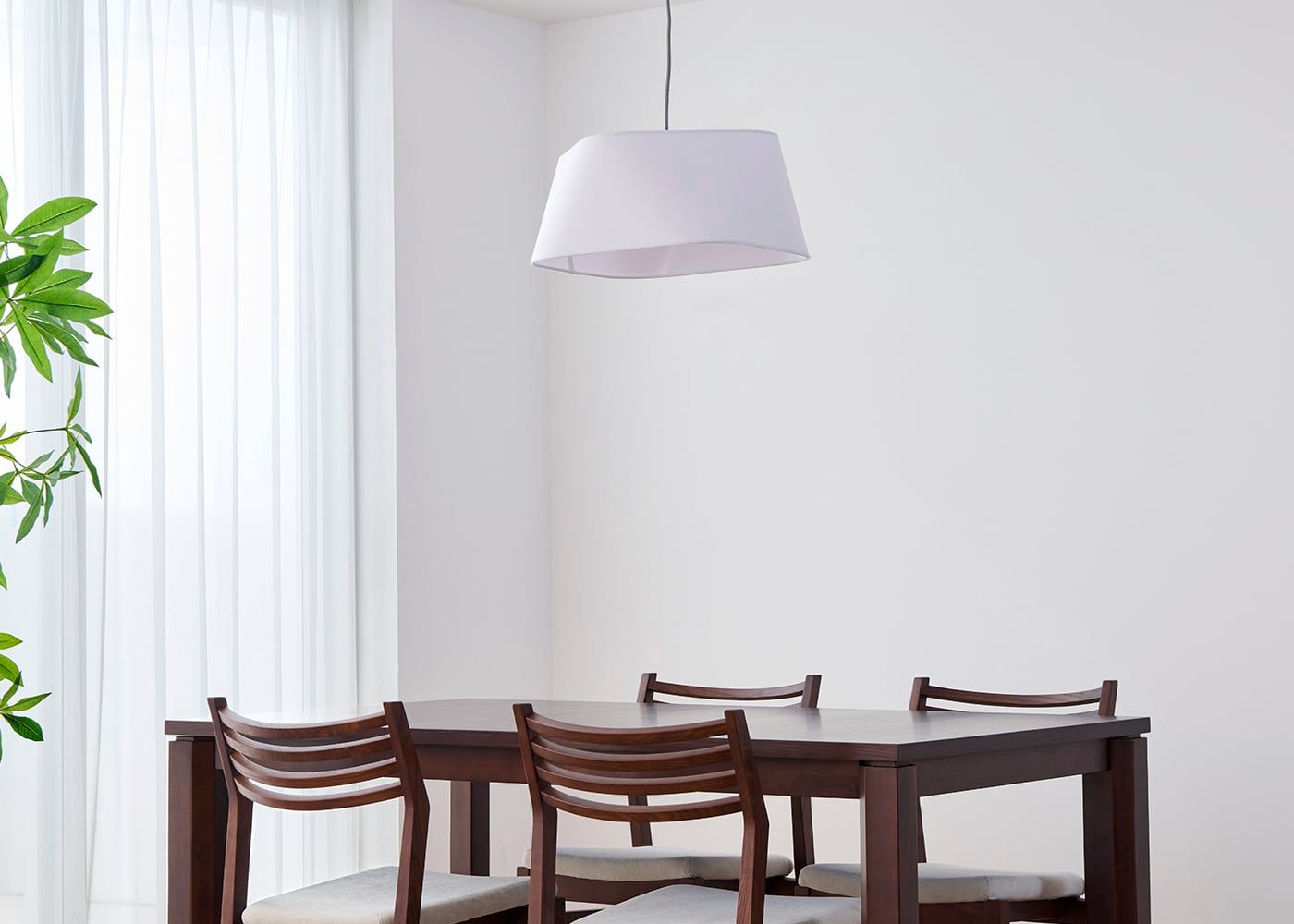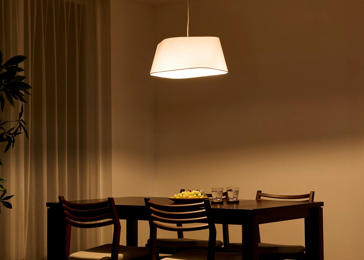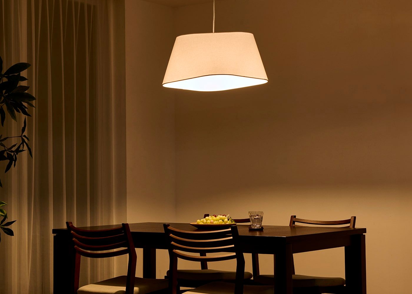 ブラウンに比べ、ホワイトはダイニング空間をより明るい光で包み込んでくれます。(写真はS(shallow) ホワイト、電球ON)