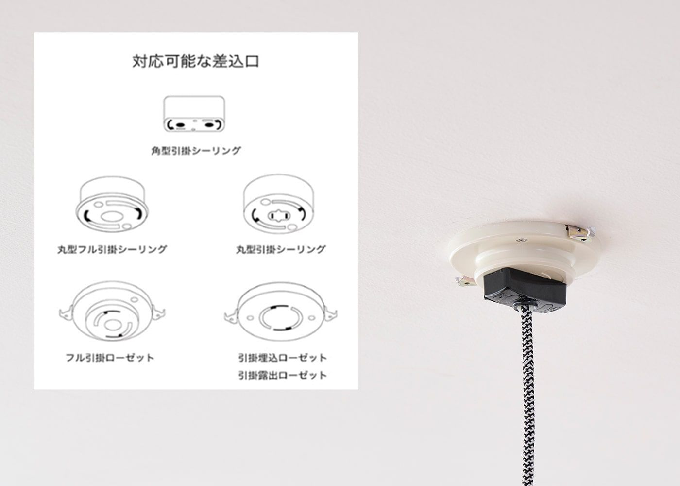 電源プラグは一般的な家庭用シーリング仕様となっており、図示されたいずれかの差込口があれば簡単に取り付けが可能です。ご自宅の形状をご確認の上、取り付けを行ってください。
