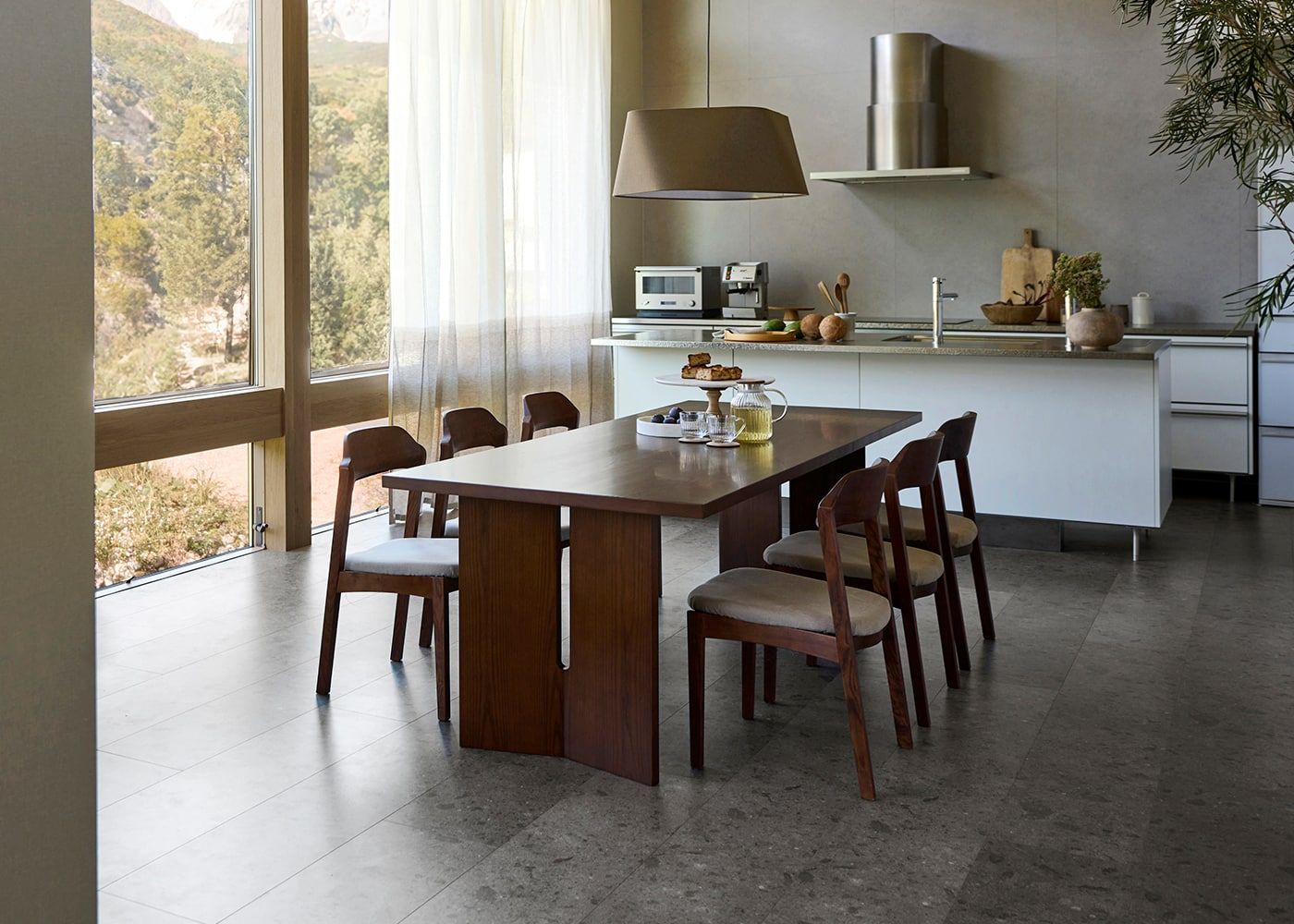 凛とした空気感に包まれる、アースカラーのナチュラルモダンなダイニングコーディネート。Espresso 3-pendantは大地や山々の雄大さを表現したダイニングにマッチする、存在感のあるサイズとデザインが魅力。(写真はL ブラウン)
