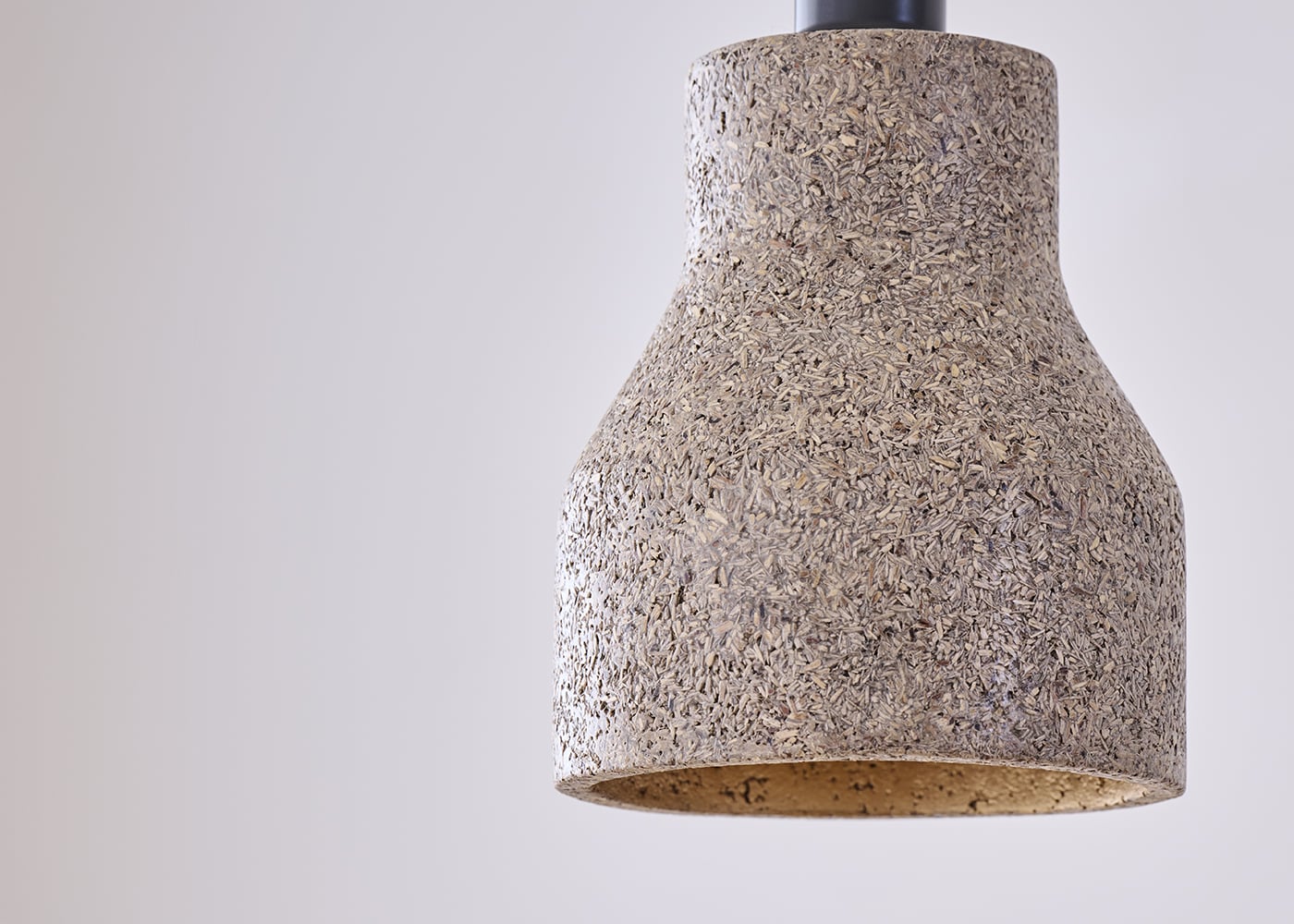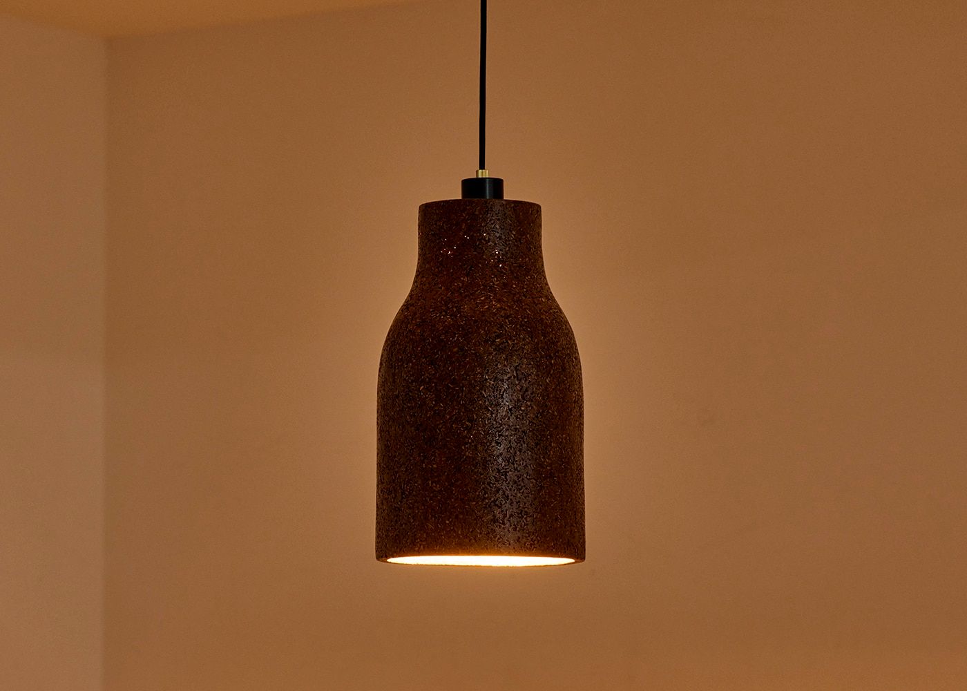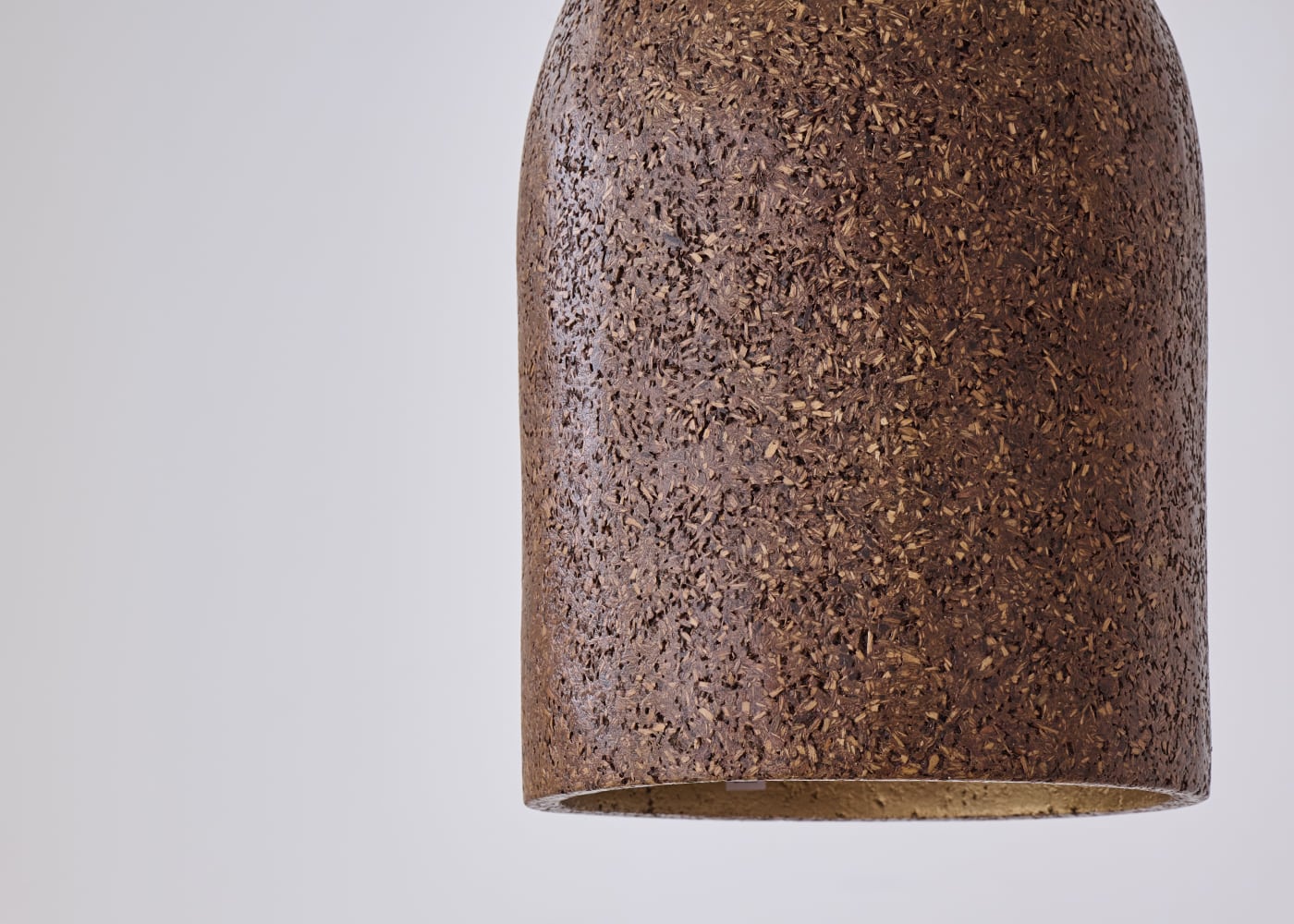 NOVA PENDANTのシェードには小枝や樹脂などの農業廃材を再製した素材を使用。廃材を再利用することで環境への負荷を抑え、唯一無二のデザインをお楽しみいただけます。(写真はL ブラウン、電球OFF)