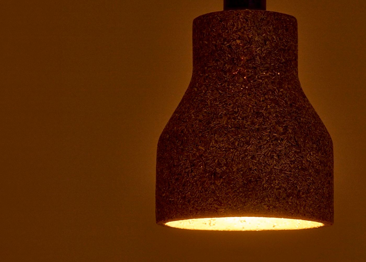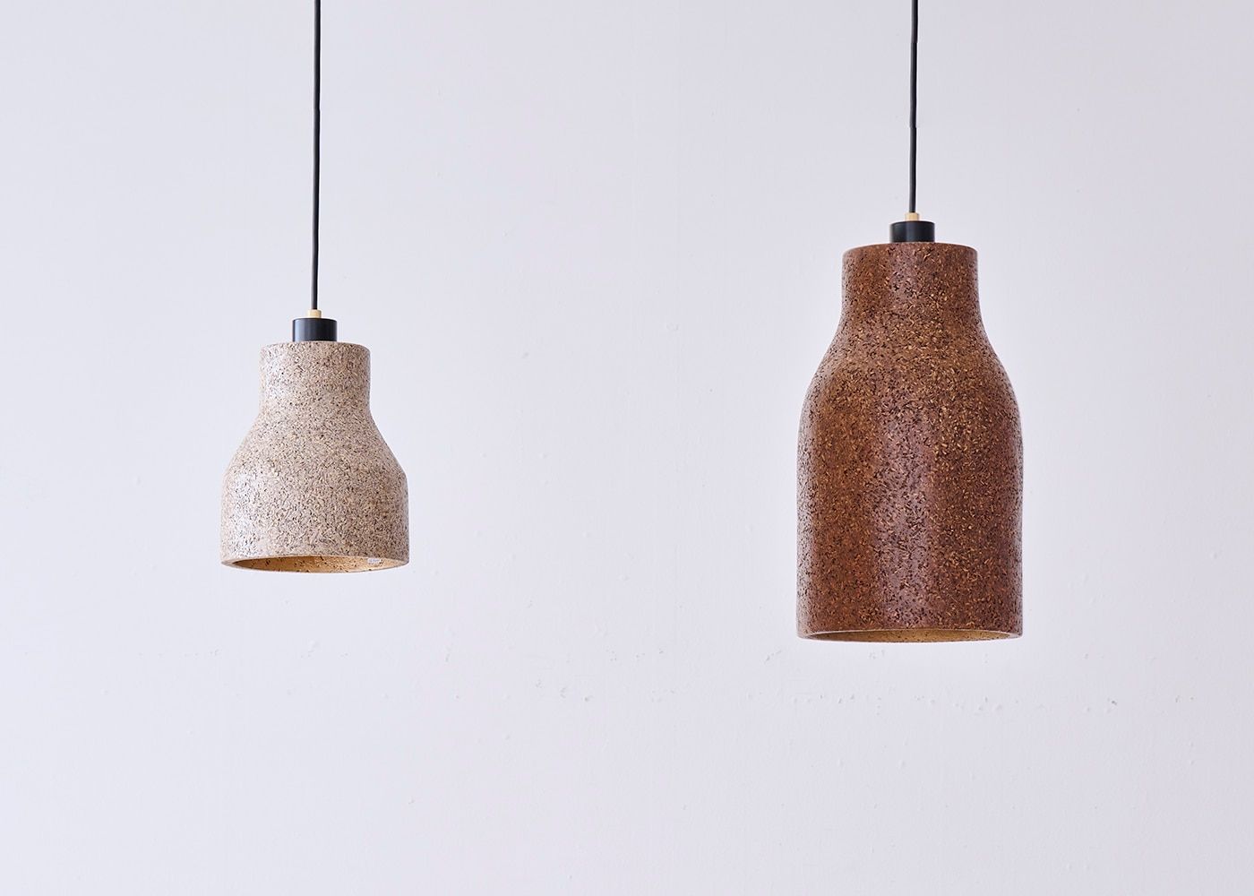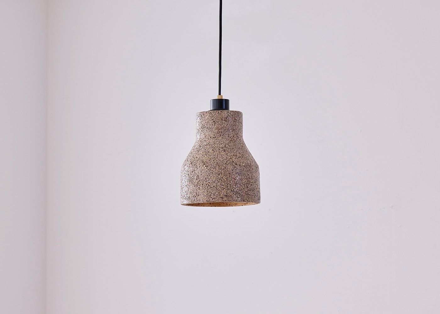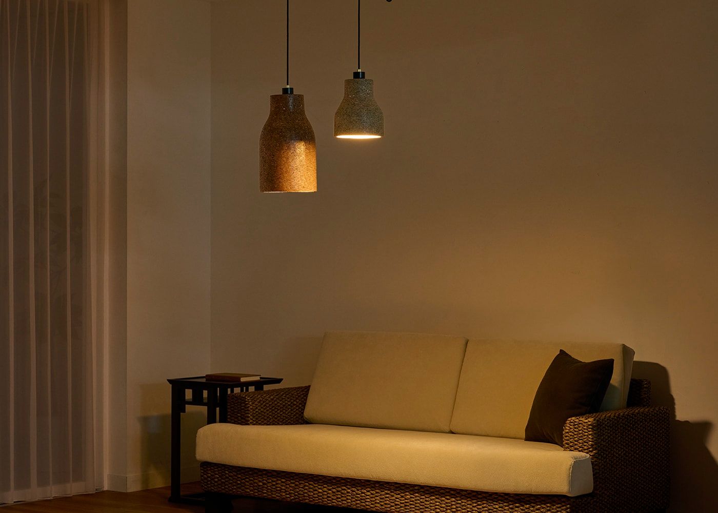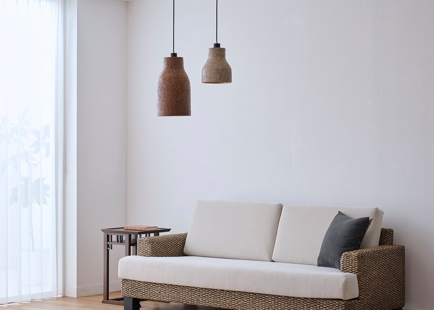 農業廃材を活用し、環境に配慮した素材で生み出されたNOVA PENDANT。独特な風合いを生かしながらシンプルなデザインに仕上げており、さまざまな空間に自然と調和する照明です。(写真左がL ブラウン、写真右がS アイボリー。電球OFF)