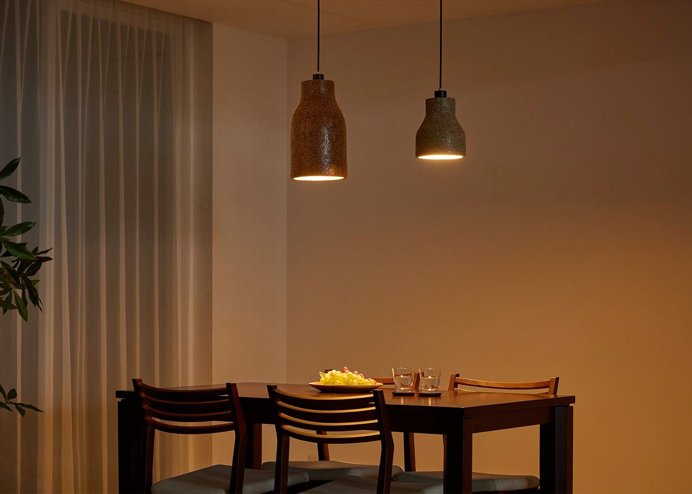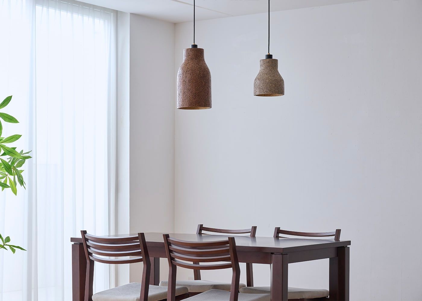 サイズの違う照明を使うことで視覚的に立体感が生まれ、空間に動きを与えます。また、照明の明るさや広がりを調整して、ダイニングをより魅力的に演出してみましょう。(写真左がL ブラウン、写真右がS アイボリー。電球ON)