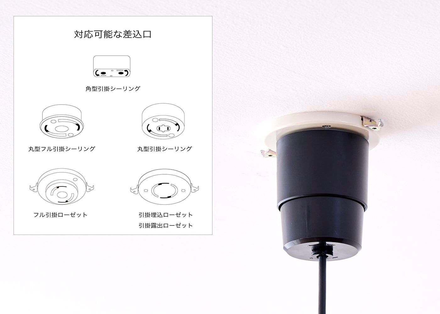 電源プラグは一般的な家庭用シーリング仕様となっており、図示されたいずれかの差込口があれば簡単に取り付けが可能です。ご自宅の形状をご確認の上、取り付けを行ってください。