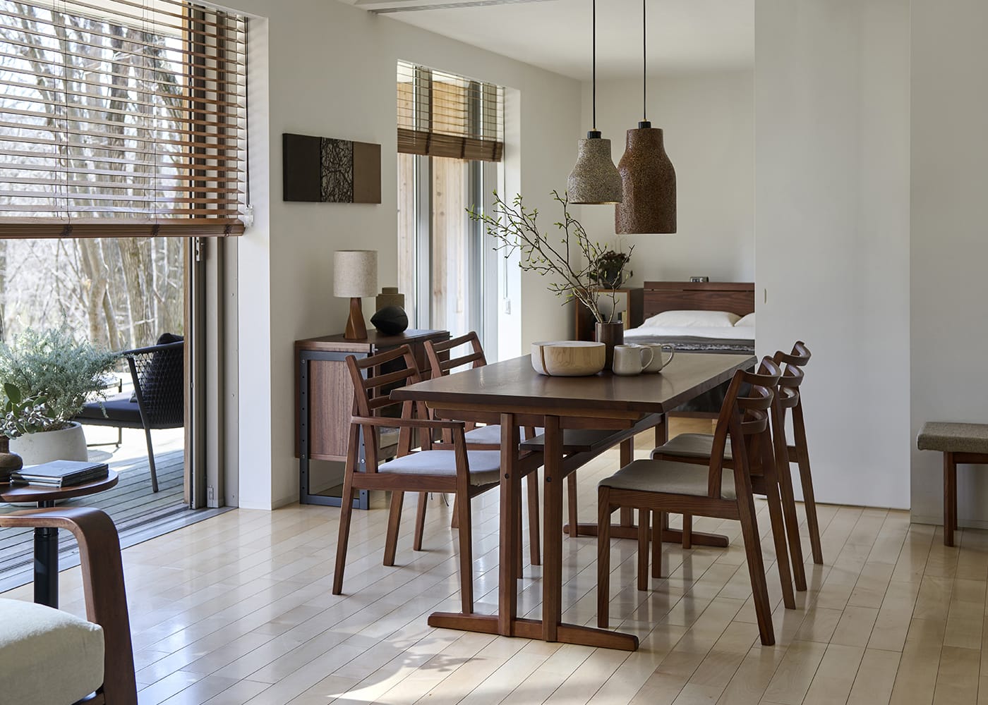 シンプルでおしゃれな部屋を楽しむブラウンのダイニングコーディネート。NOVA PENDANTは無垢材を使用したダイニングに最適な、素材感のあるデザインが魅力です。(写真左がS、写真右がL。電球OFF)