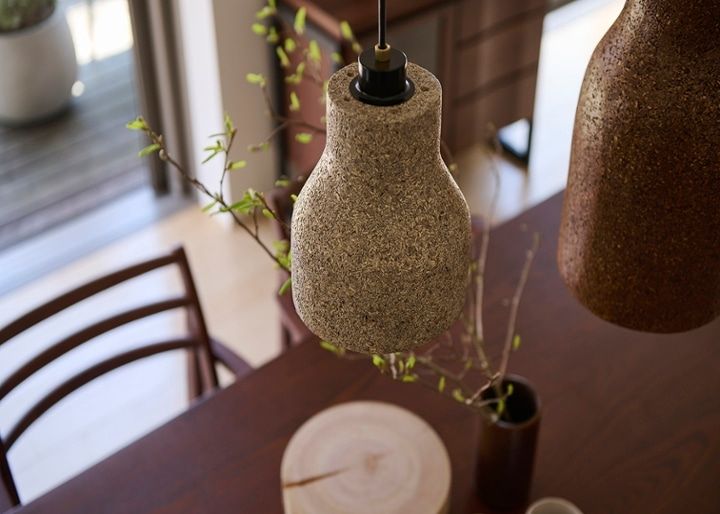 NOVA PENDANTのシェードには小枝や樹脂などの農業廃材を再製した素材を使用。廃材を再利用することで環境への負荷を抑え、唯一無二のデザインをお楽しみいただけます。(写真はL ブラウン、電球OFF)