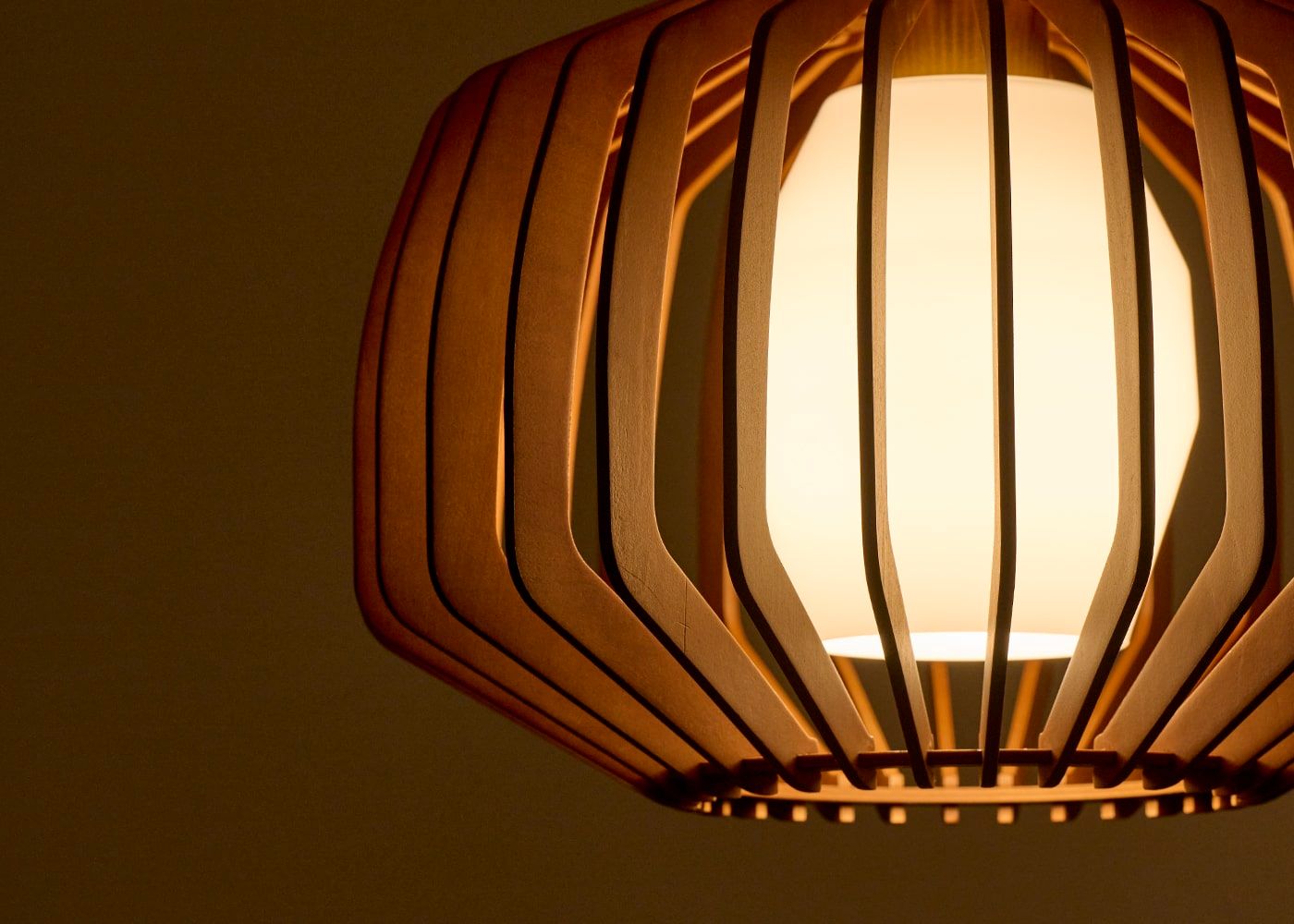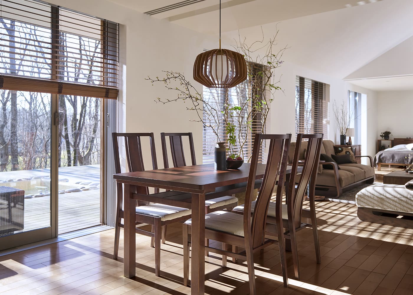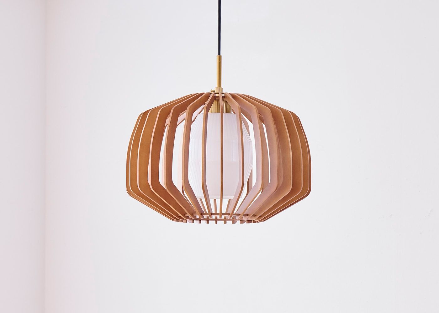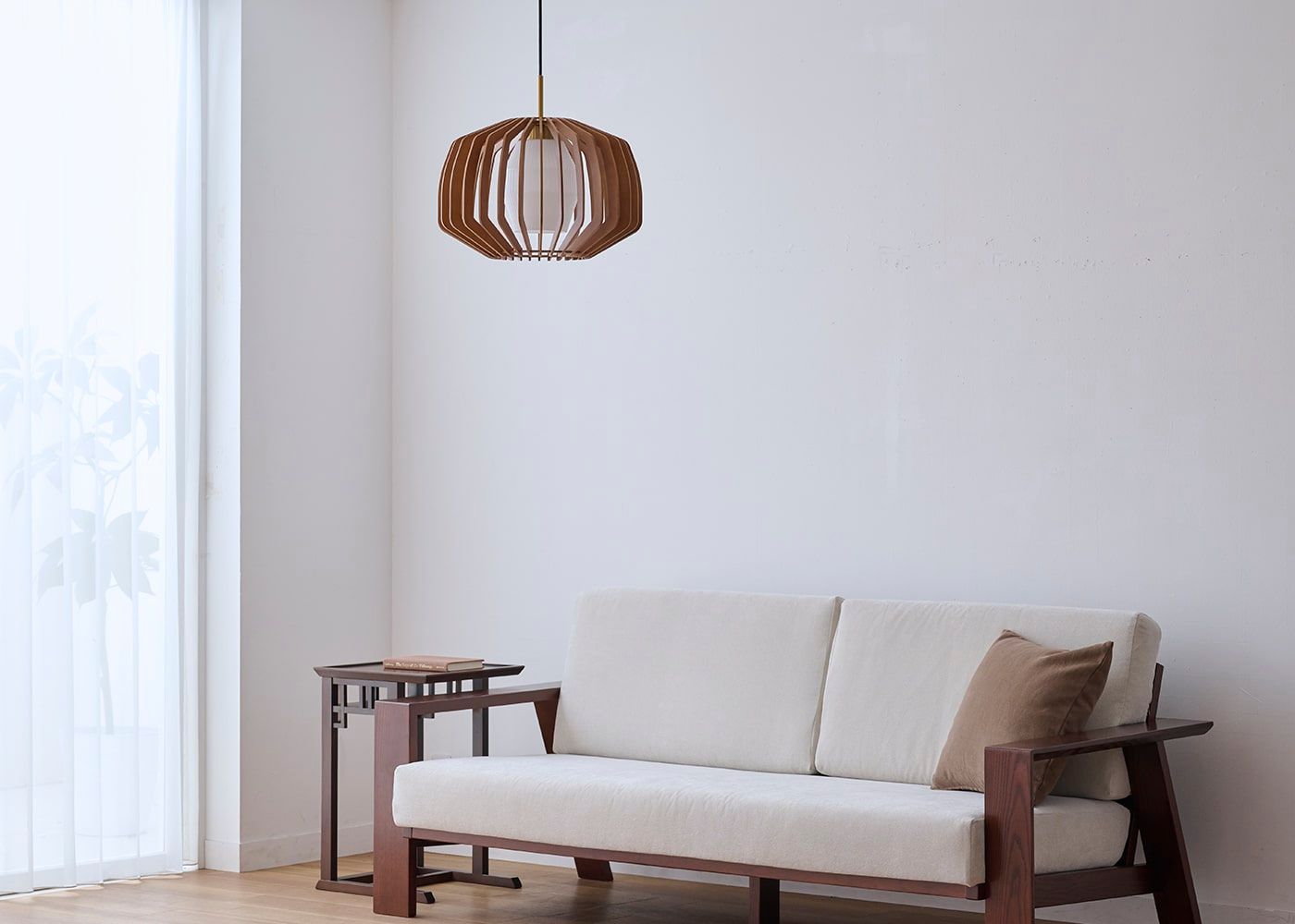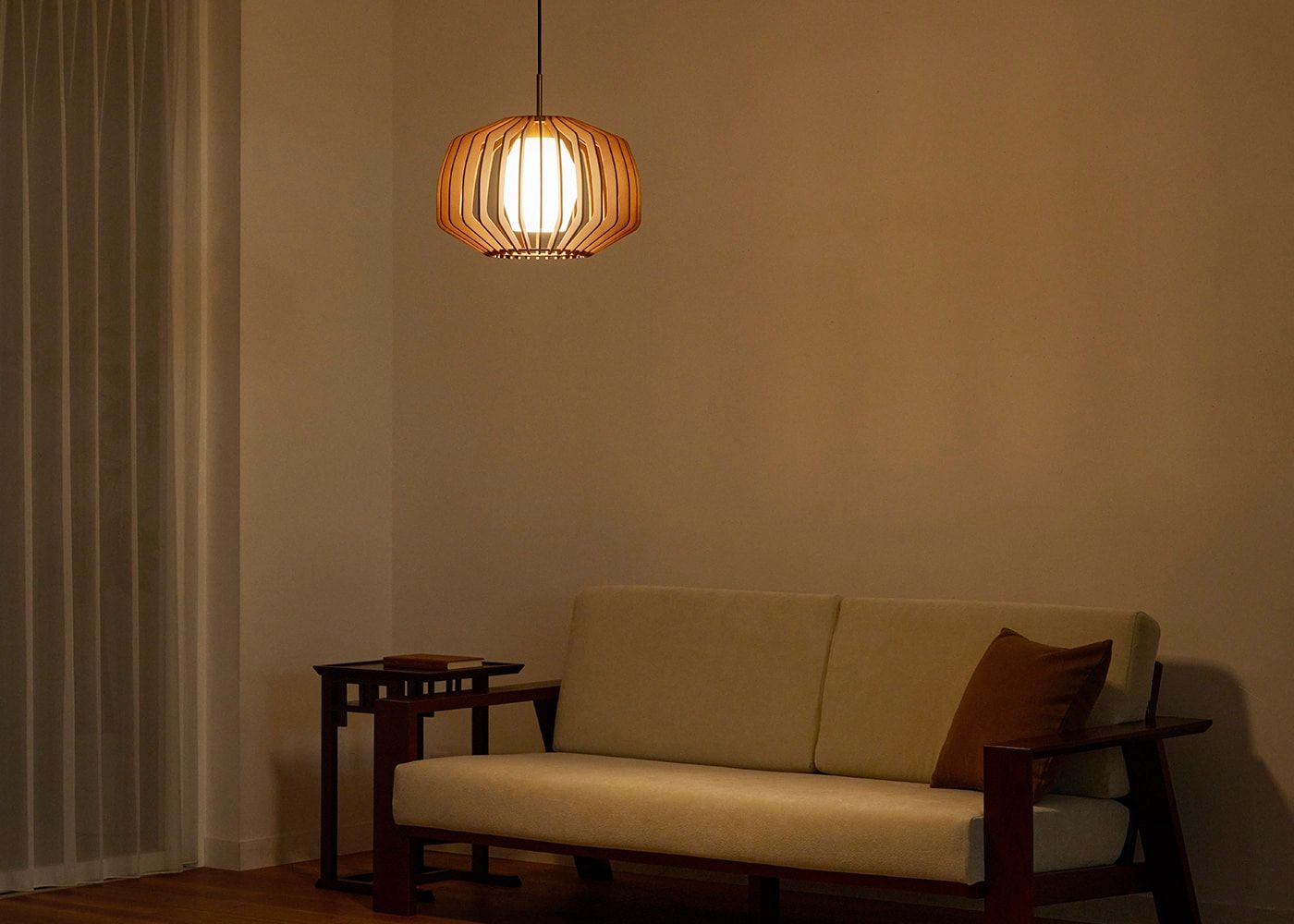 ペンダントライトはリビングルームの主照明としても活躍してくれます。木製シェードが放つ素材感と、無垢材を使用した