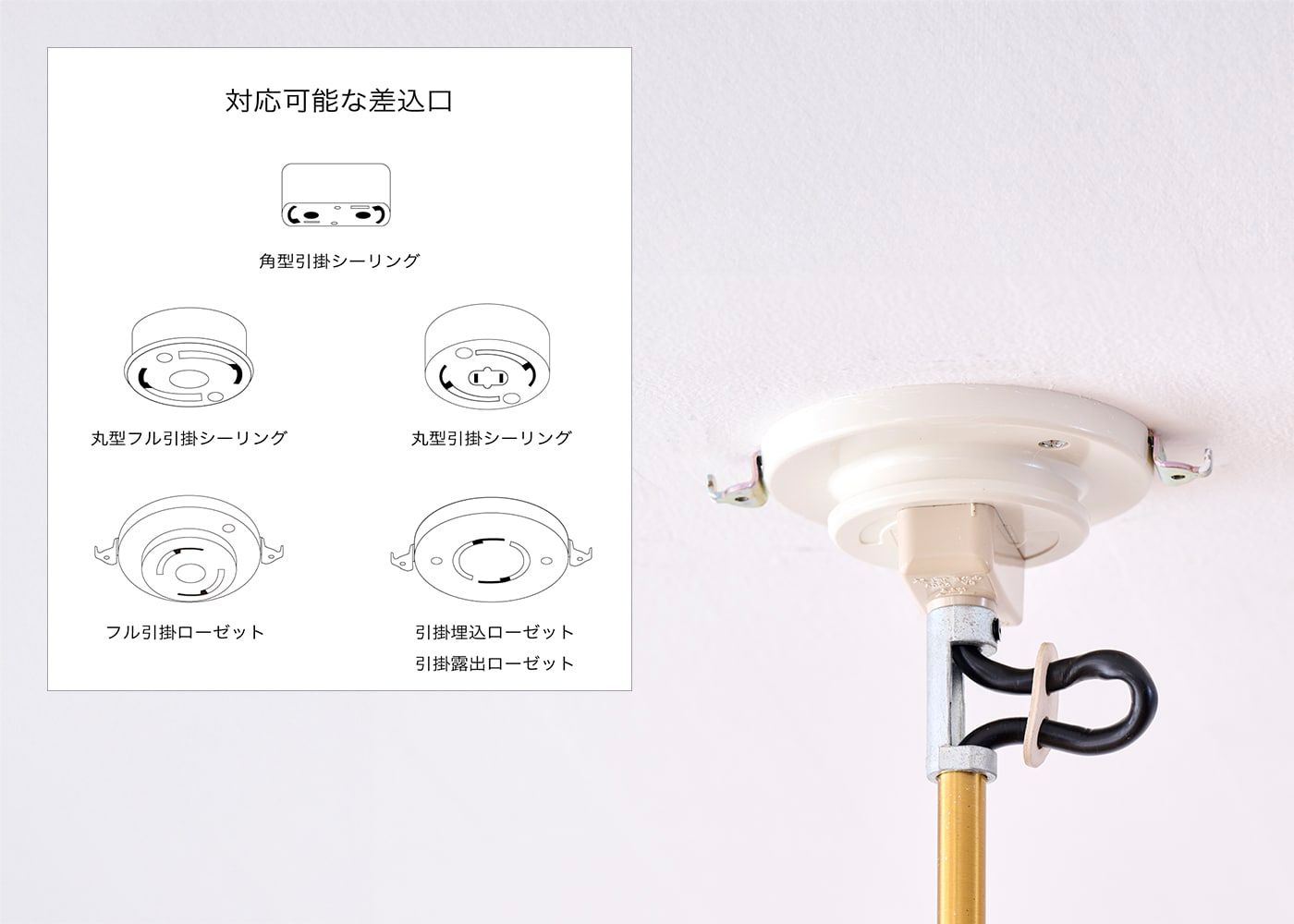 電源プラグは一般的な家庭用シーリング仕様となっており、図示されたいずれかの差込口があれば簡単に取り付けが可能です。ご自宅の形状をご確認の上、取り付けを行ってください。