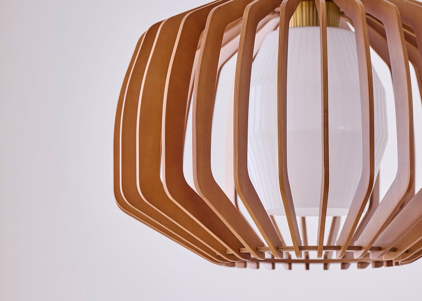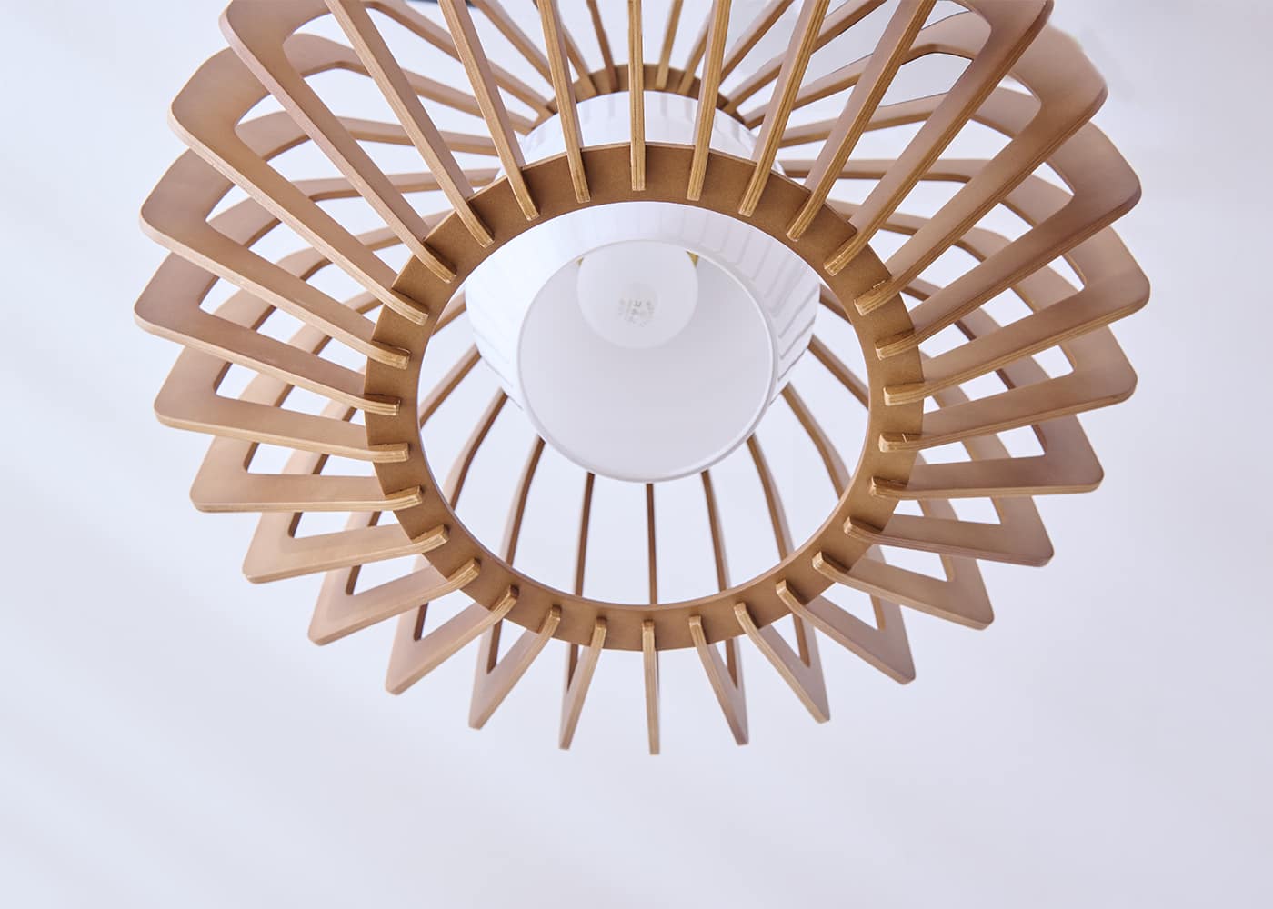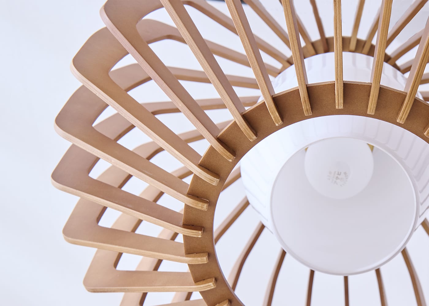 スペイン語で「球根」という意味の名を持つ、ブライウッドが30枚と上下のリングが2枚、計32のパーツで構成されているウッドシェード。楕円形にも台形にも見えるデザインが、お部屋の印象を一層引き立てます。(写真は電球OFF)