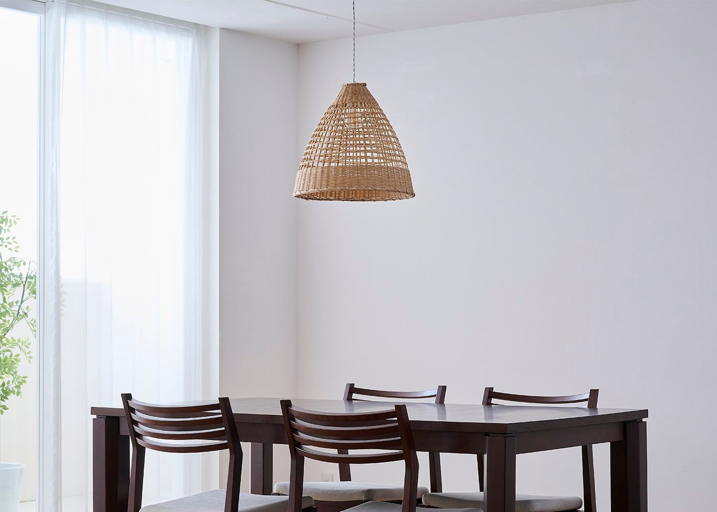 細かい竹の編み込みが特徴的なバンブー・コーン・ペンダントライトには、抜け感のあるダイニングセットを合わせて。明るいナチュラルな仕上がりにより重い印象を与えず、空間に軽やかさを与えます。