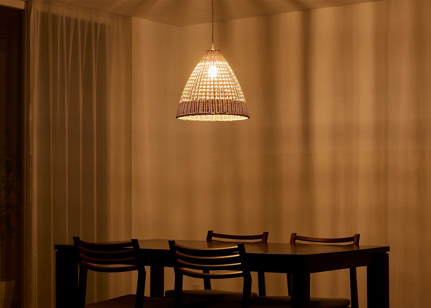 柔らかな光が編み目を通り、壁や天井に自然な陰影を描きます。温かみのある灯りが空間を包み込み、昼間とは異なる質感と存在感を際立たせます。