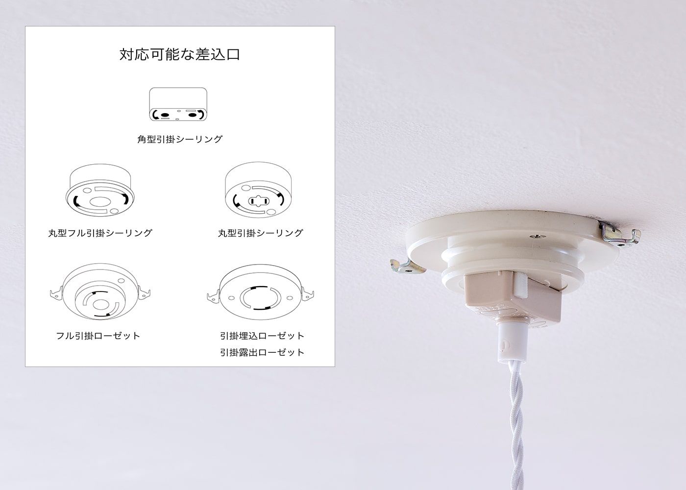 電源プラグは一般的な家庭用シーリング仕様となっており、図示されたいずれかの差込口があれば簡単に取り付けが可能です。ご自宅の形状をご確認の上、取り付けを行ってください。