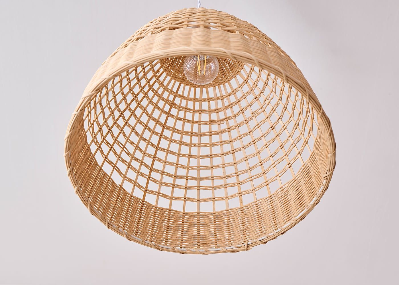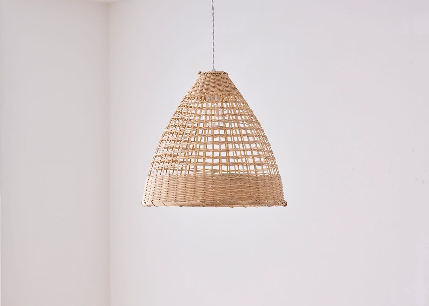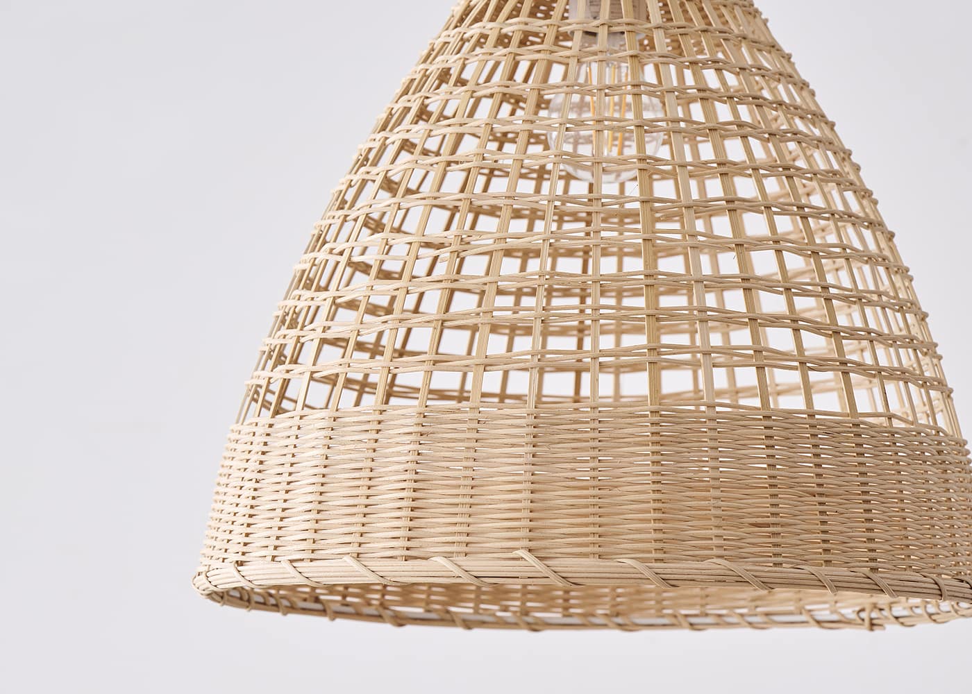 竹で編み込まれたコーン型シェードが特徴のバンブー・コーン・ペンダントライト。ダイニングに吊るすだけで、編み目や素材感が空間にやさしさを添え、温かみのあるナチュラルな雰囲気を演出します。