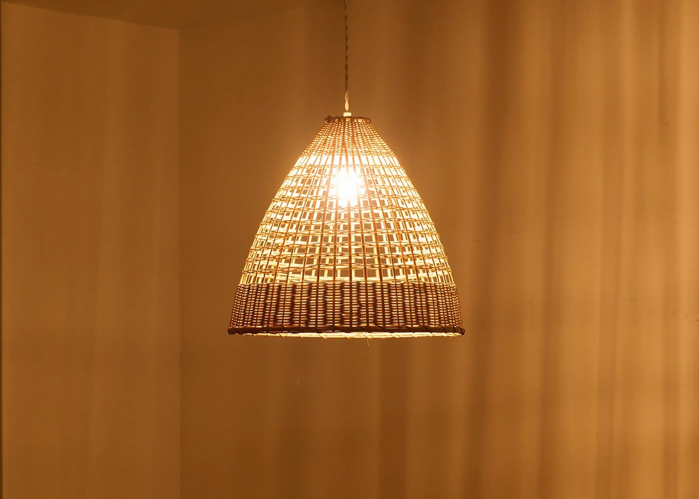 竹を丁寧に編み上げたコーン型(円錐)のフォルムが特徴で、下に広がる形が空間に安定感とさりげないアクセントを添えます。狭い部屋でも圧迫感が少なく、視線を下に誘導して空間に動きとリズムを加えます。