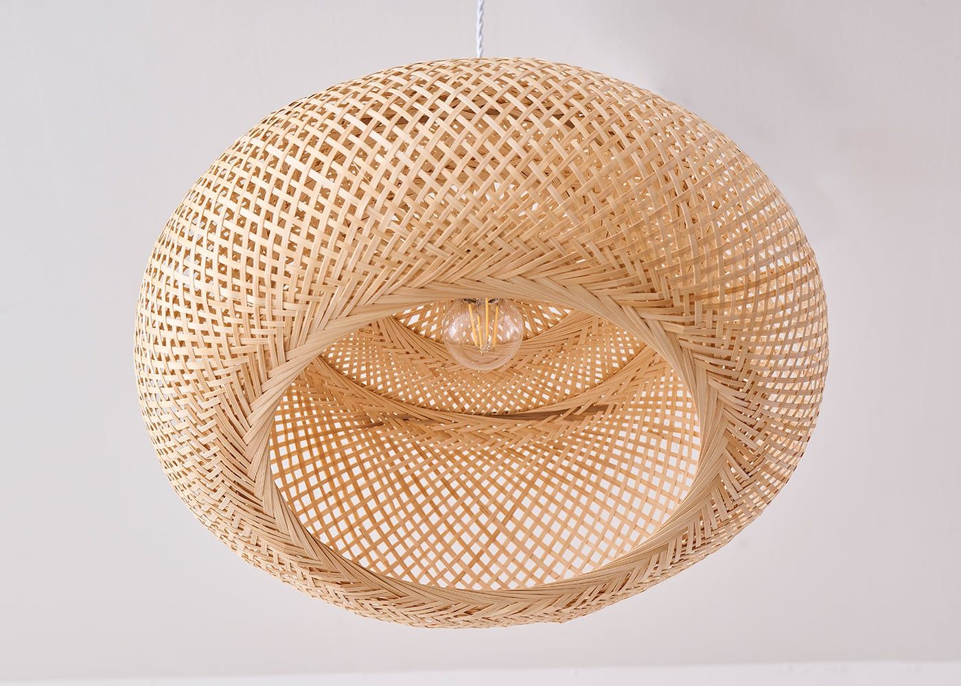 しなやかな竹を生かし、一本一本を手作業で丁寧に編み上げています。環境に配慮した再生素材を用い、編み目のやわらかい表情が空間に安らぎを添えるつくりです。(写真は電球OFF)