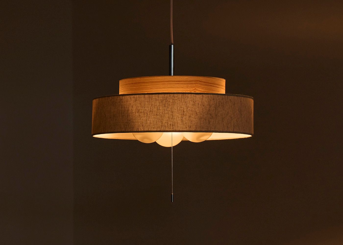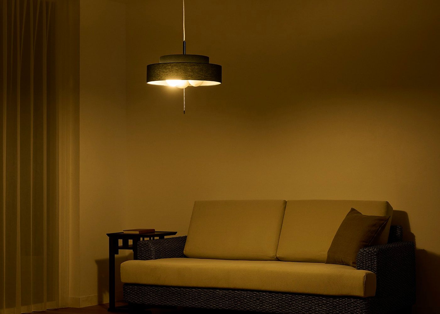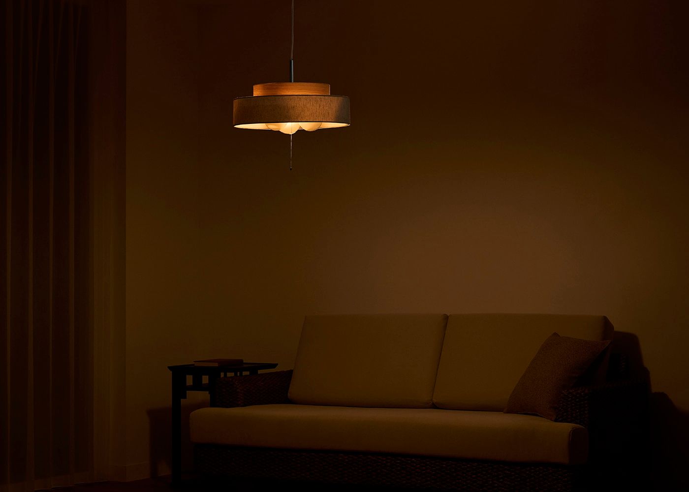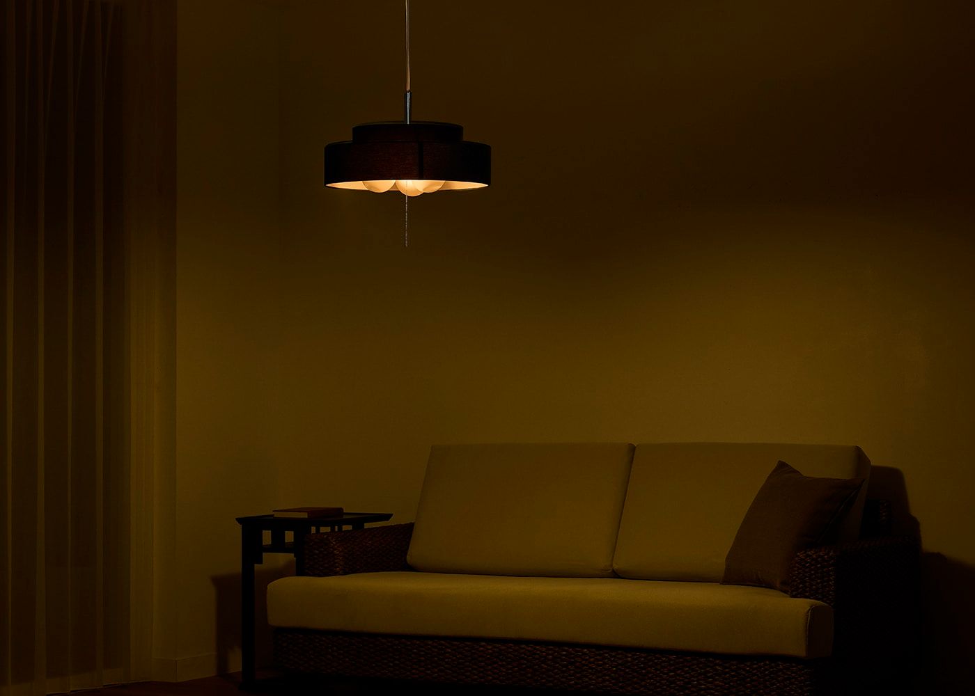 スイッチを入れればシェードの織り目が浮かび上がり、透過した光がお部屋を温かく照らします。素材の重なりが生む柔らかな陰影は、日中とは異なる温かな表情が魅力。お部屋に奥行きと深い安らぎを醸し出します。