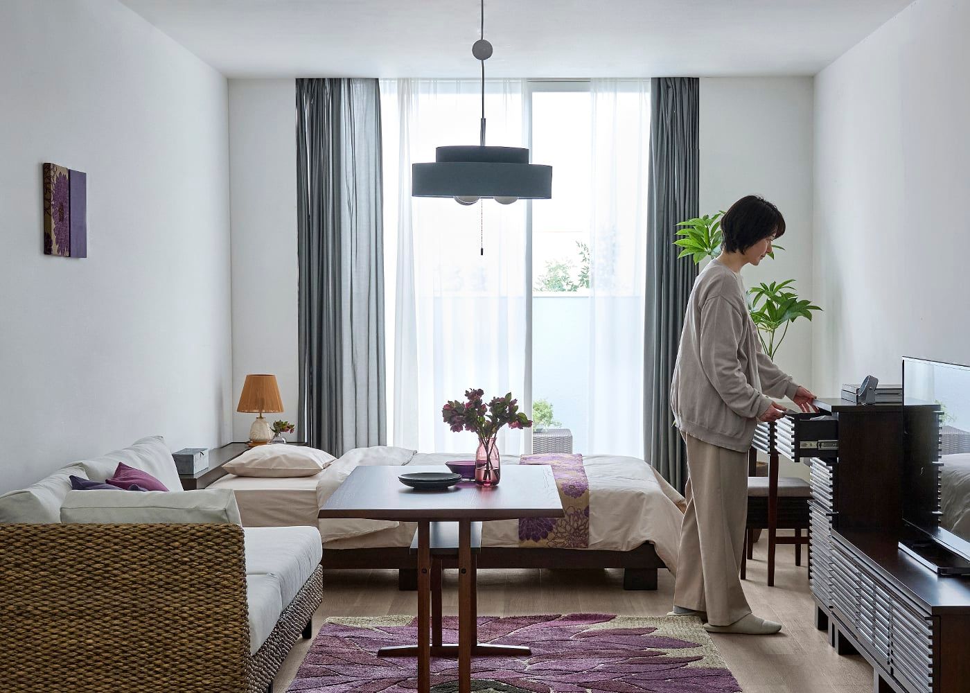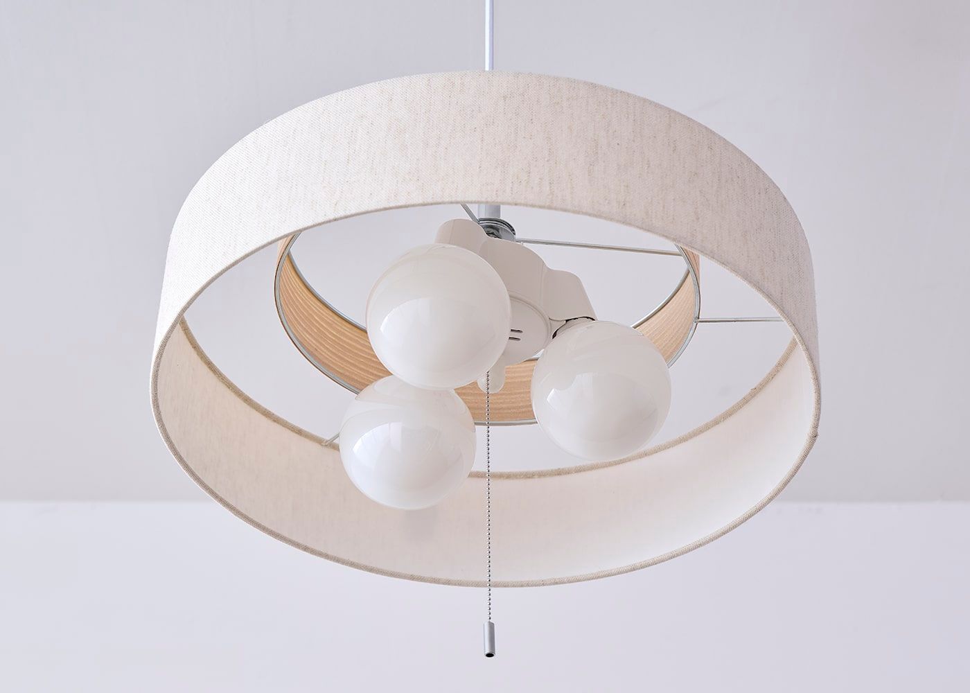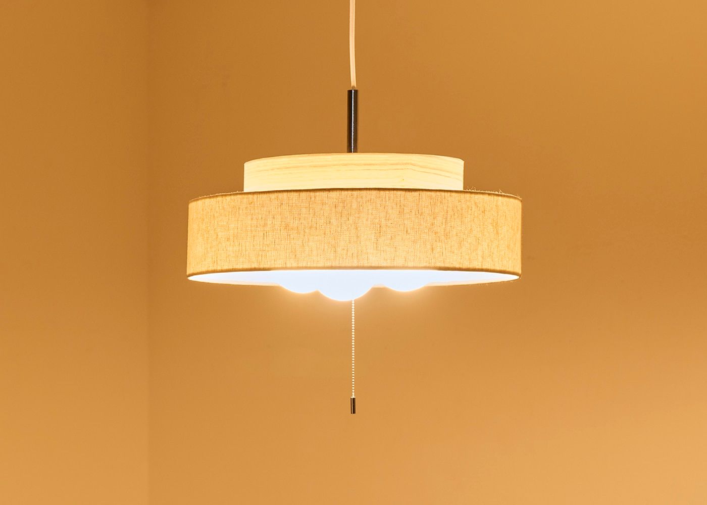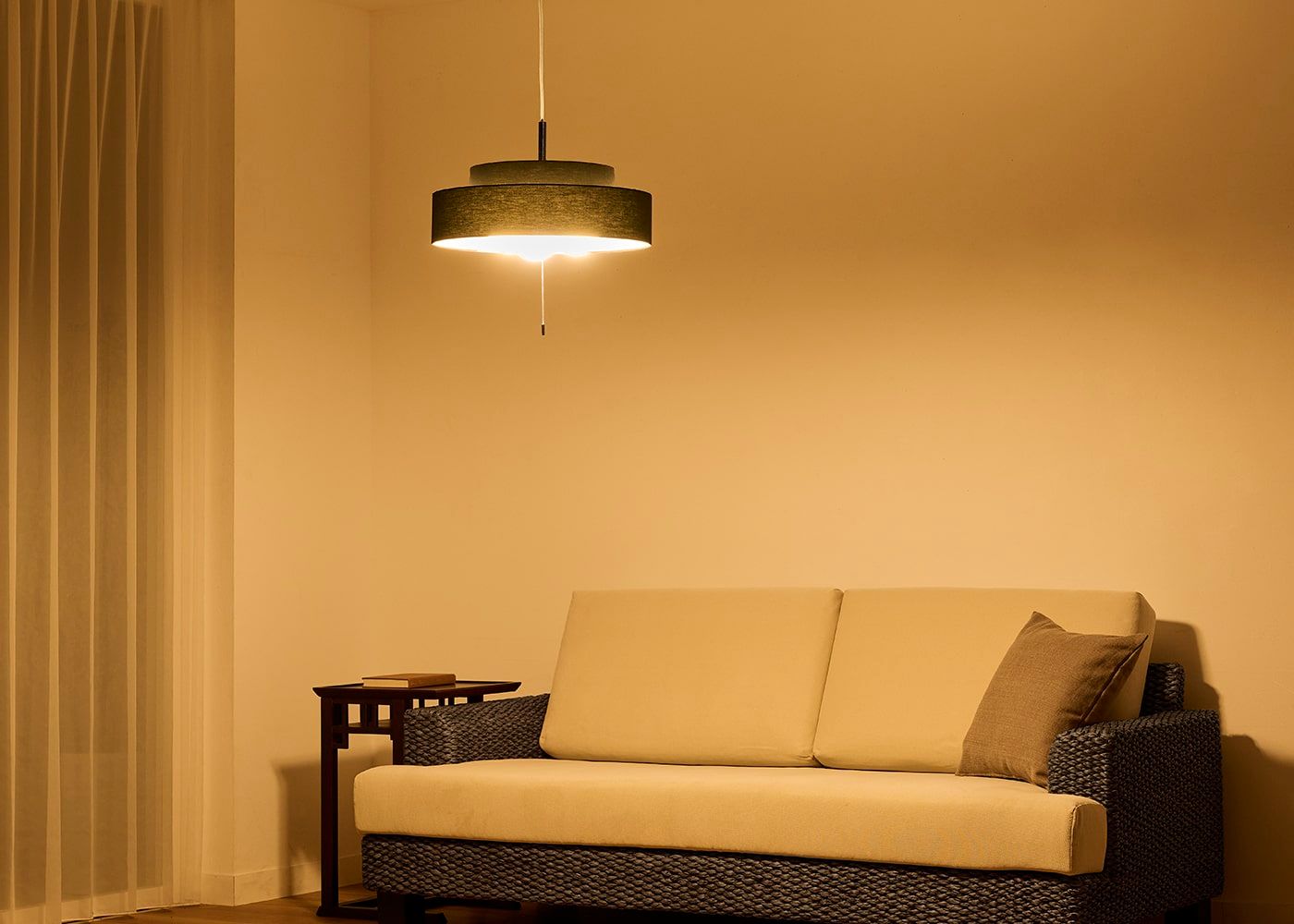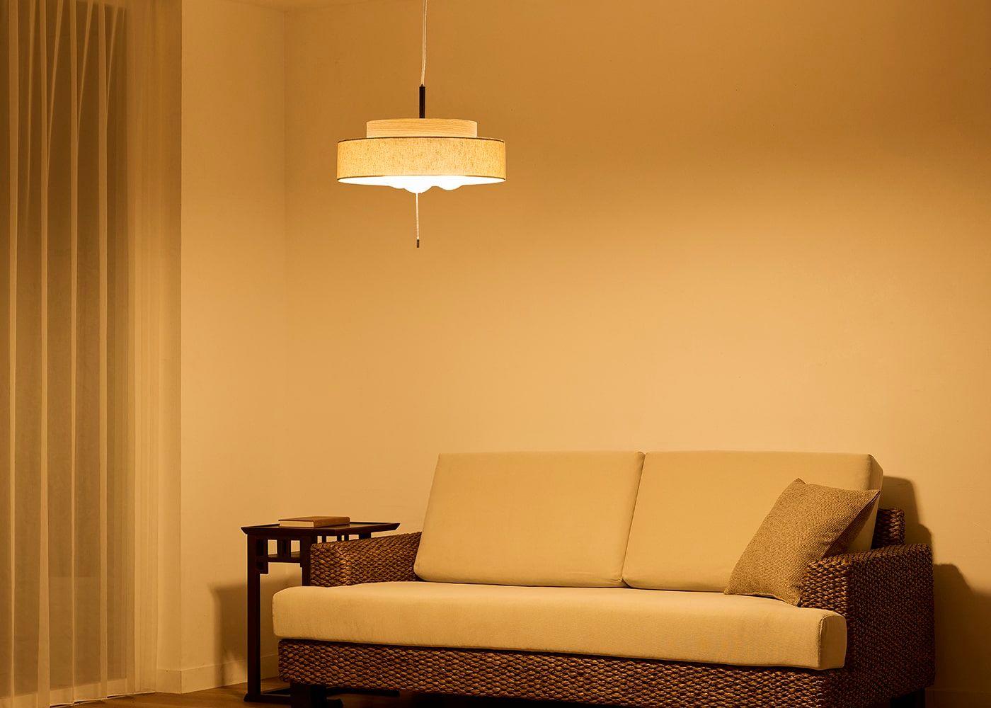 スイッチを入れればシェードの織り目が浮かび上がり、透過した光がお部屋を温かく照らします。素材の重なりが生む柔らかな陰影は、日中とは異なる温かな表情が魅力。お部屋に奥行きと深い安らぎを醸し出します。