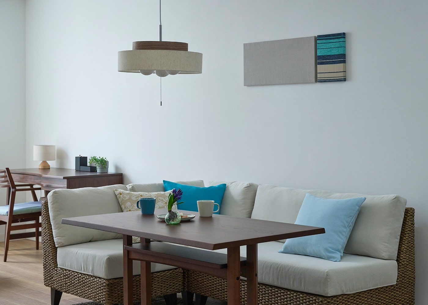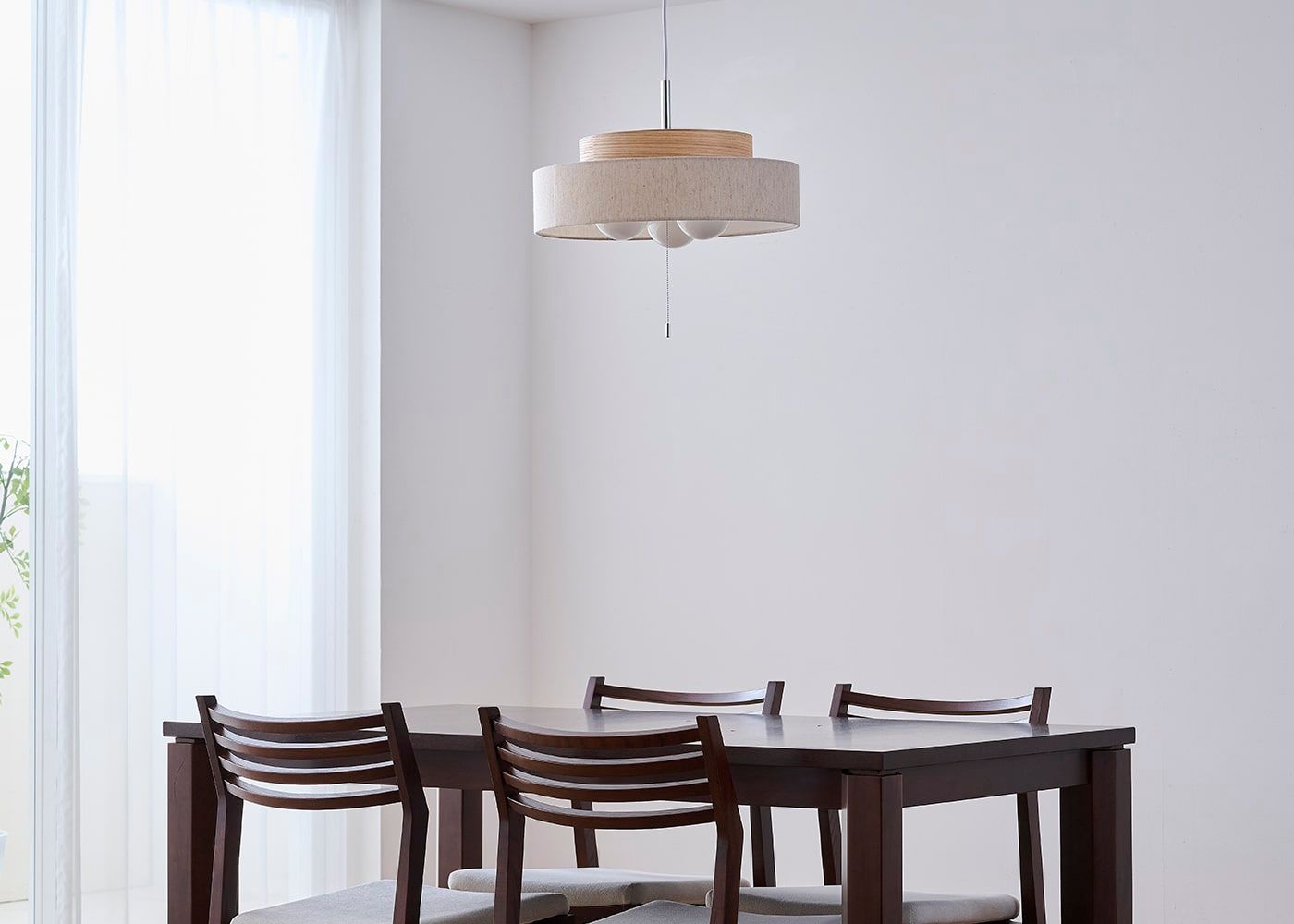 天然木と布地を組み合わせたナチュラルなシェードは、無垢材の家具や編み込み素材のソファと美しく調和。ダイニングテーブルやソファカバーの配色とリンクさせることで、空間に心地よいリズムが生まれます。