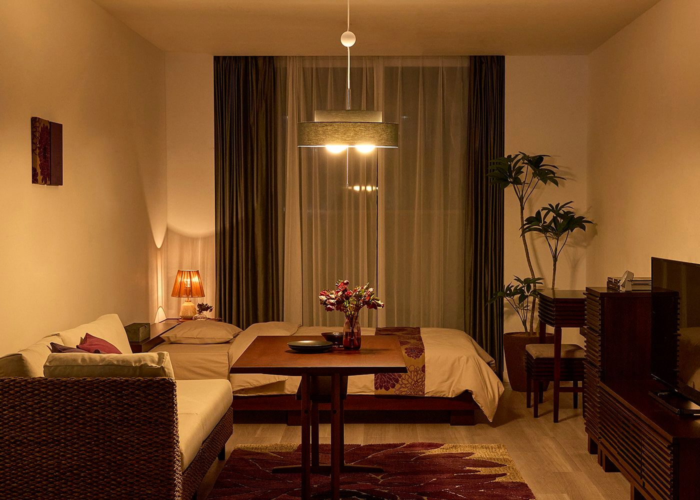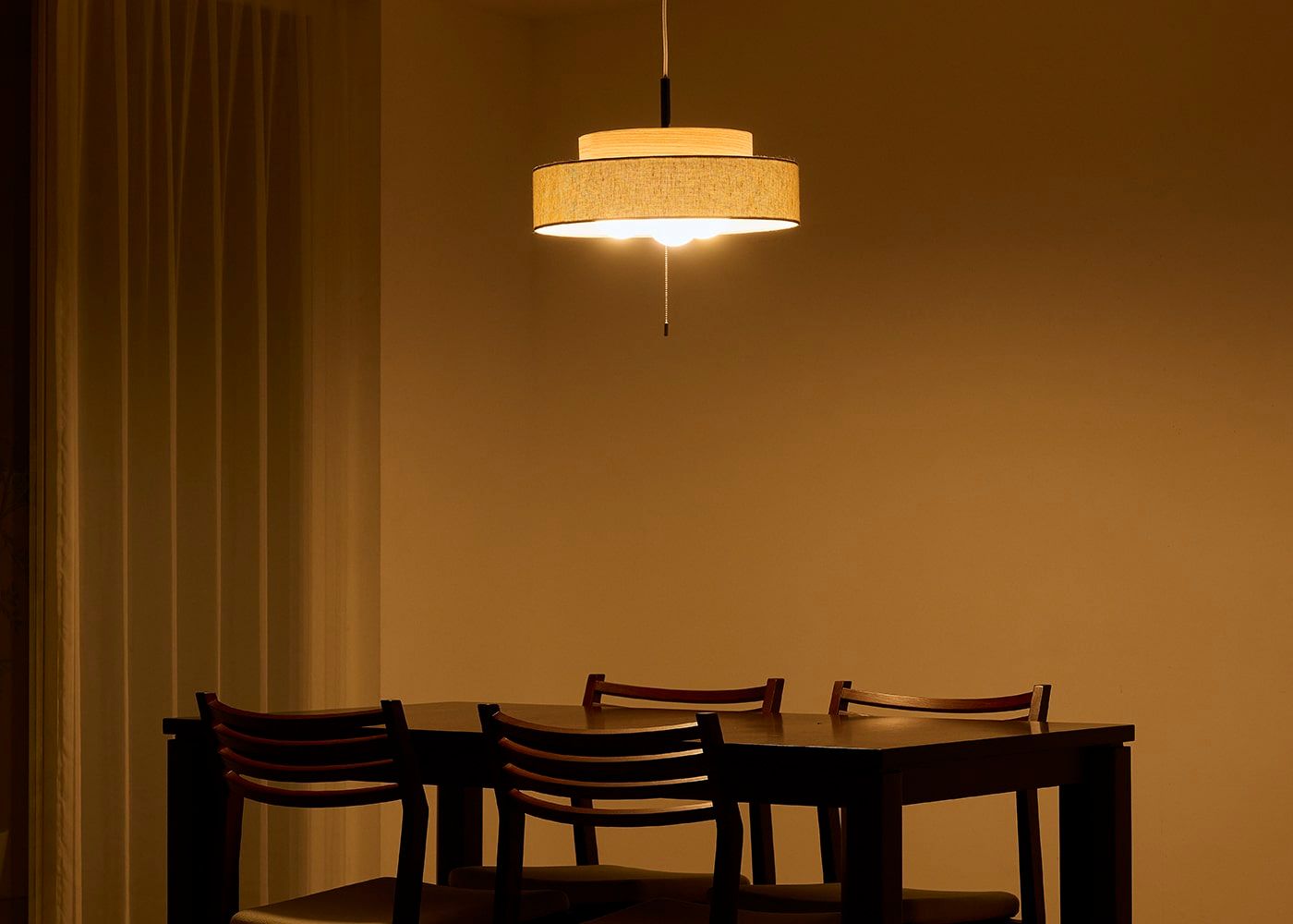 夜の灯りは、昼間とは違う特別な表情を見せてくれます。二層のシェードから漏れる柔らかな光が、壁面や家具に美しい陰影を刻み、まるでリゾートのような奥行きのある寛ぎの時間を紡ぎ出します。(写真は電球3灯ON)