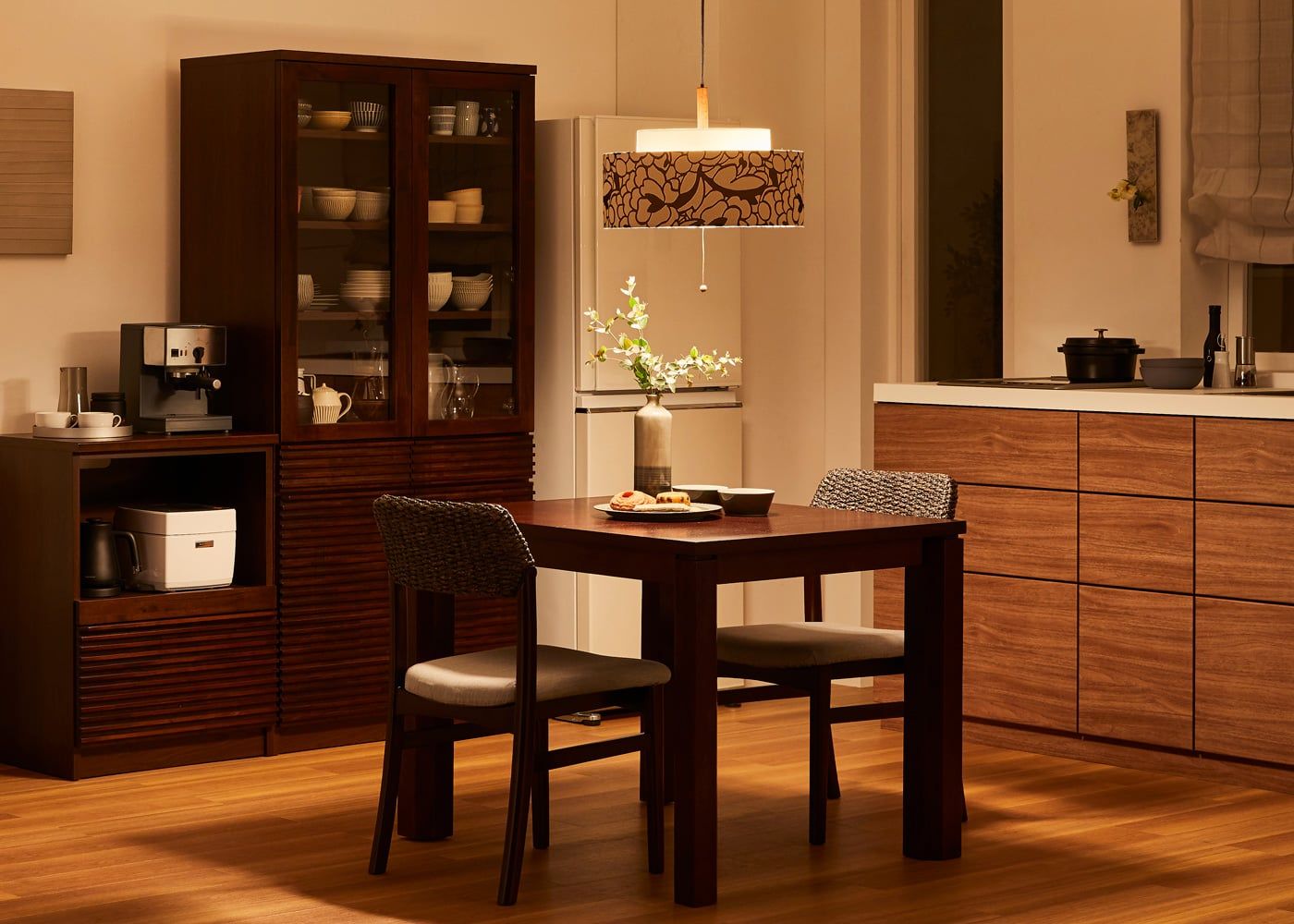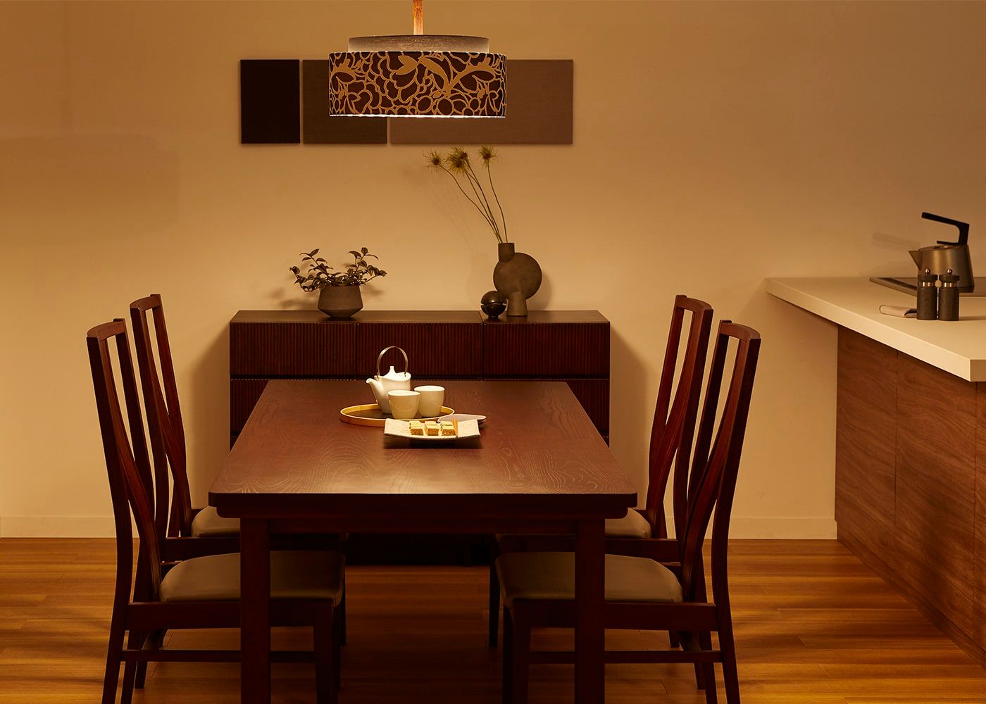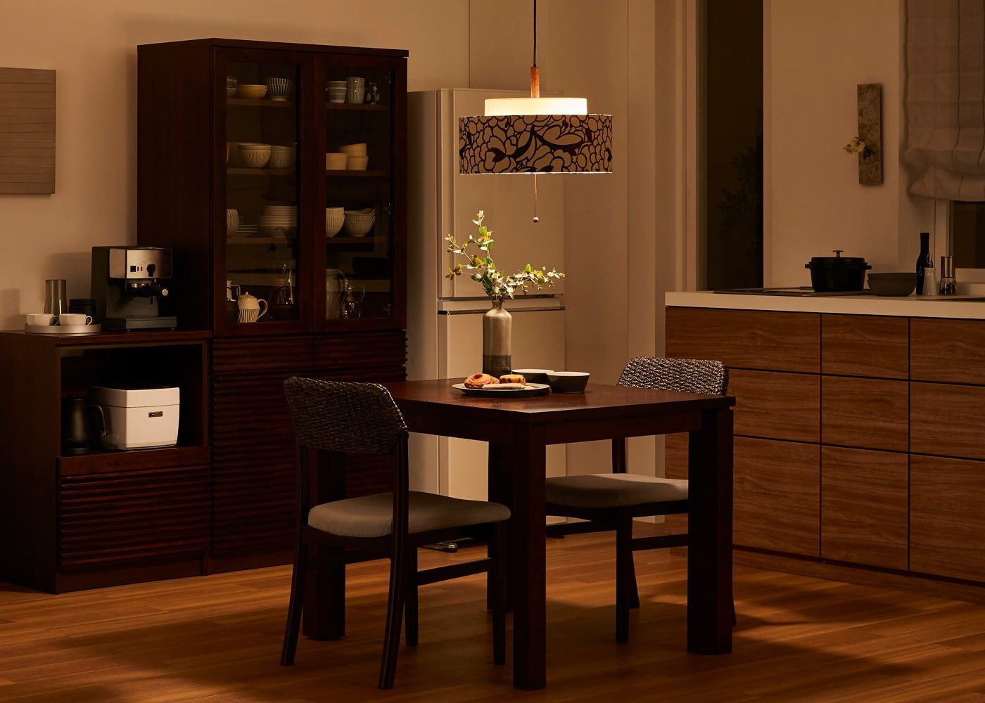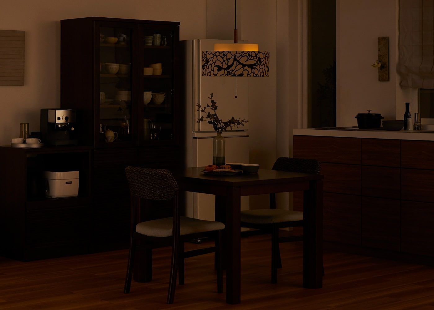 広い空間でもしっかりと明るさを確保しつつ、シェード越しのやわらかな光で落ち着きのある雰囲気を演出します。模様や陰影も美しく、食卓を華やかに彩ります。
