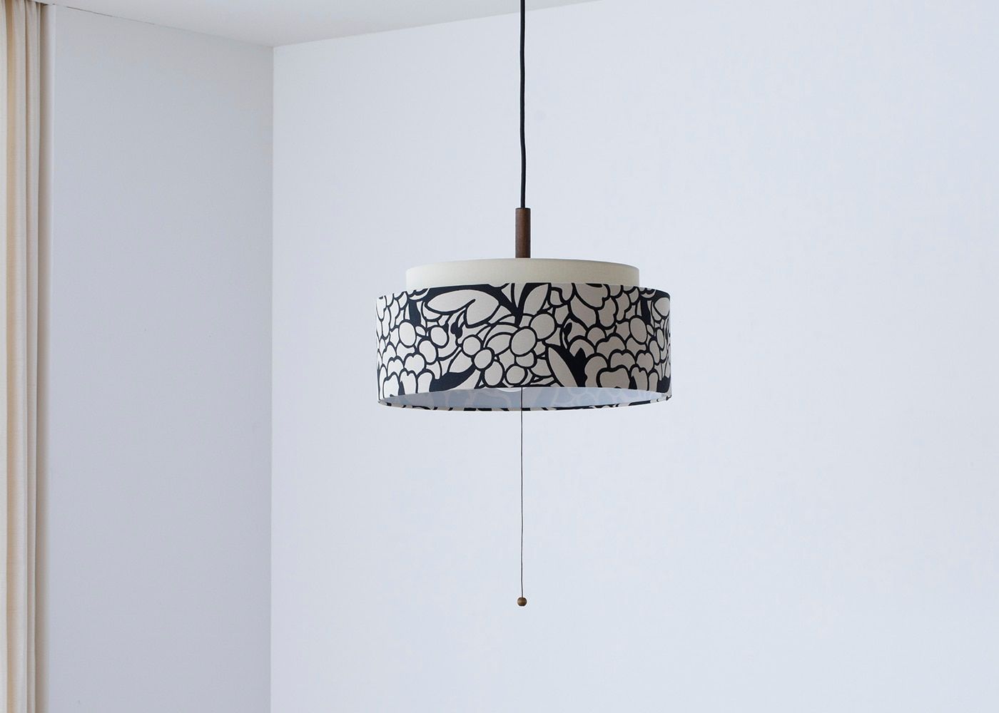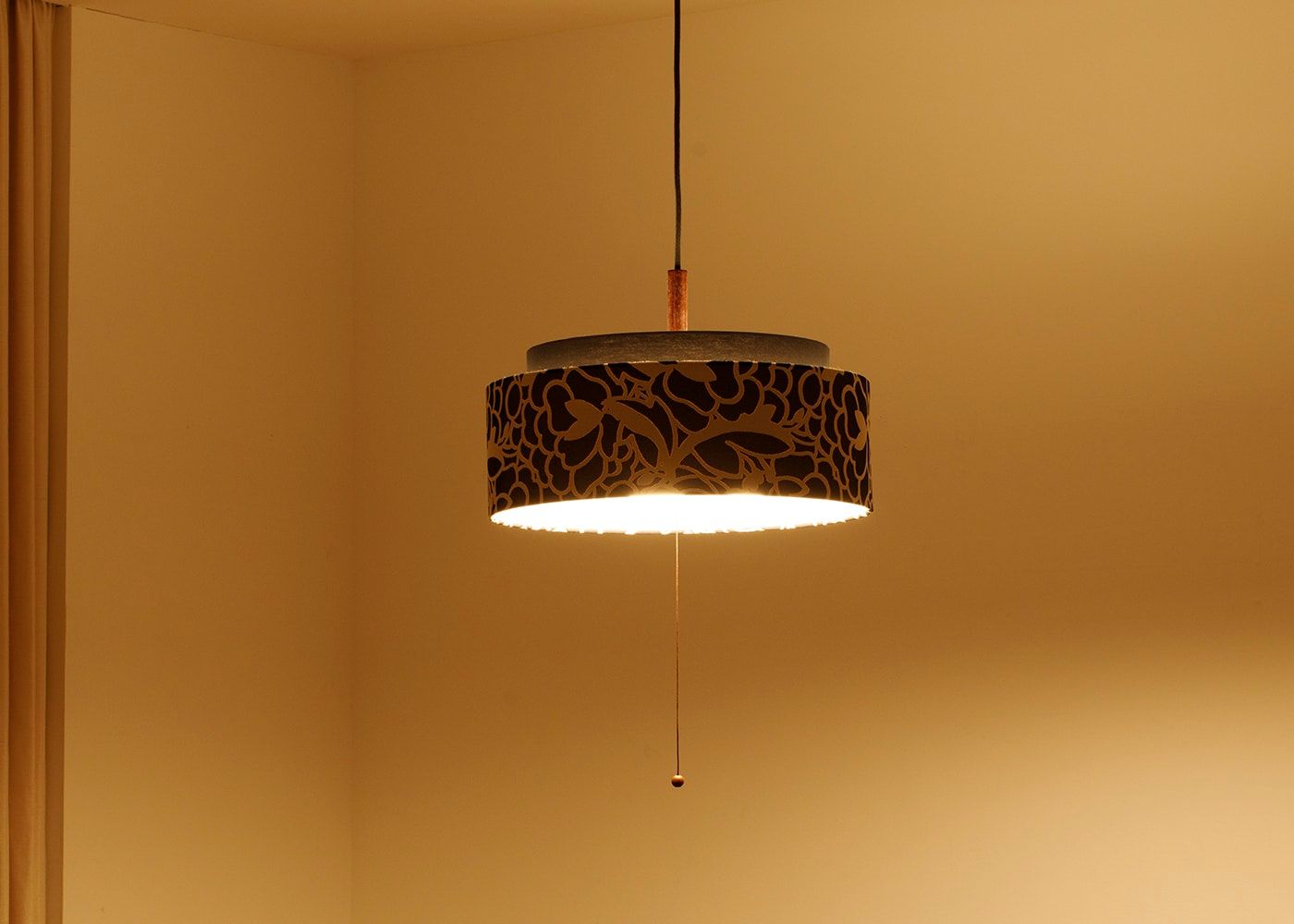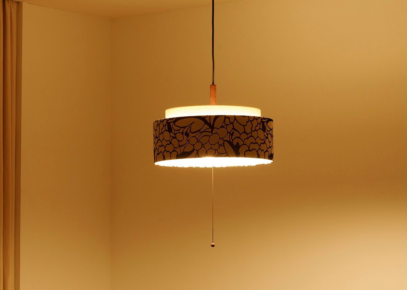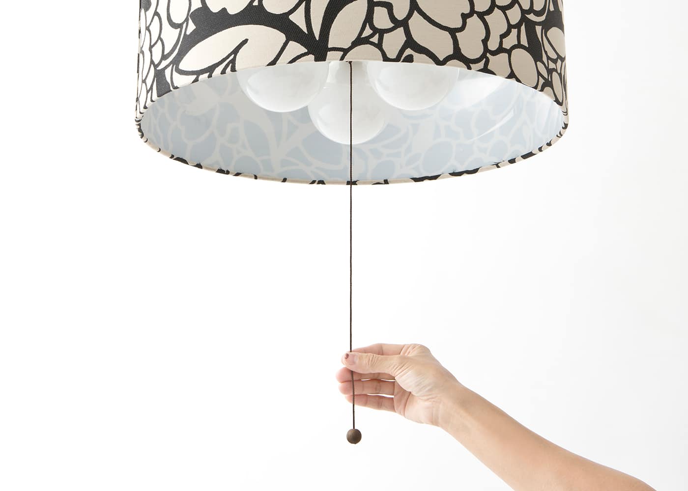 電球の3灯→1灯→常夜灯→OFFの切り替えはプルスイッチ仕様。スイッチが引き易いよう、取っ手に木球がついています。