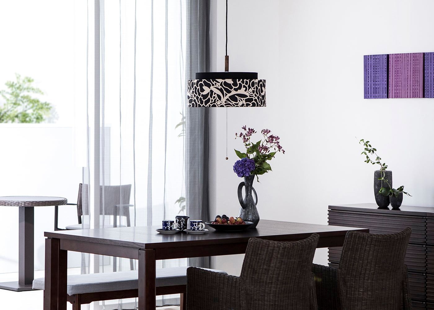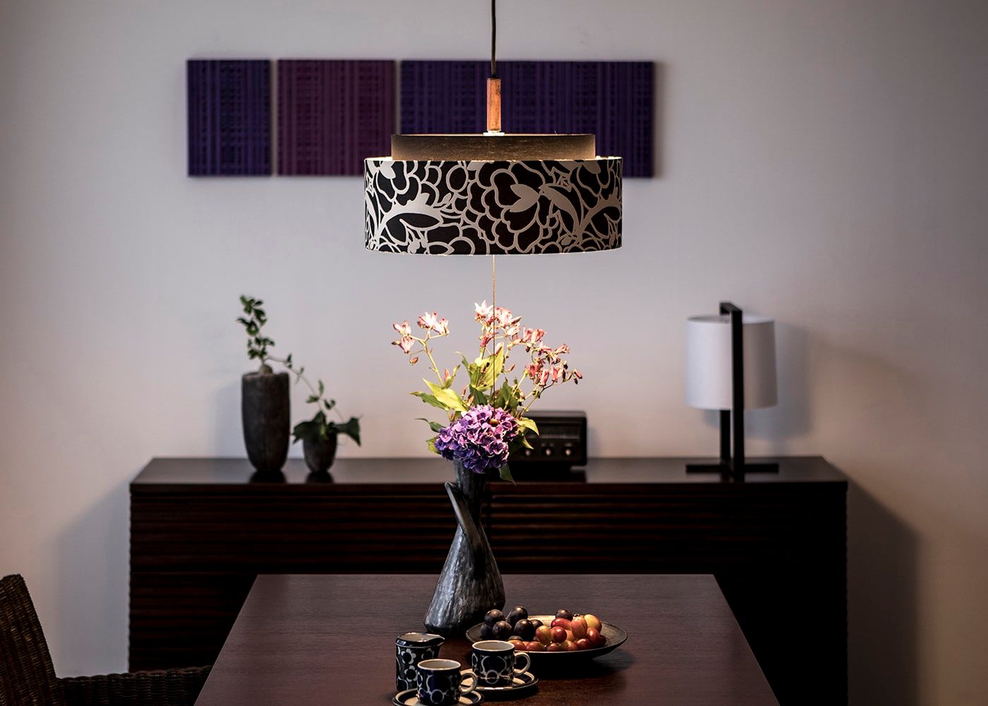 シェードを透過する灯りによって、花柄のモチーフがより際立ちます。洗練されたダイニングにやさしい灯りと優雅さを添えてくれる照明です。(※この照明を使った実例は