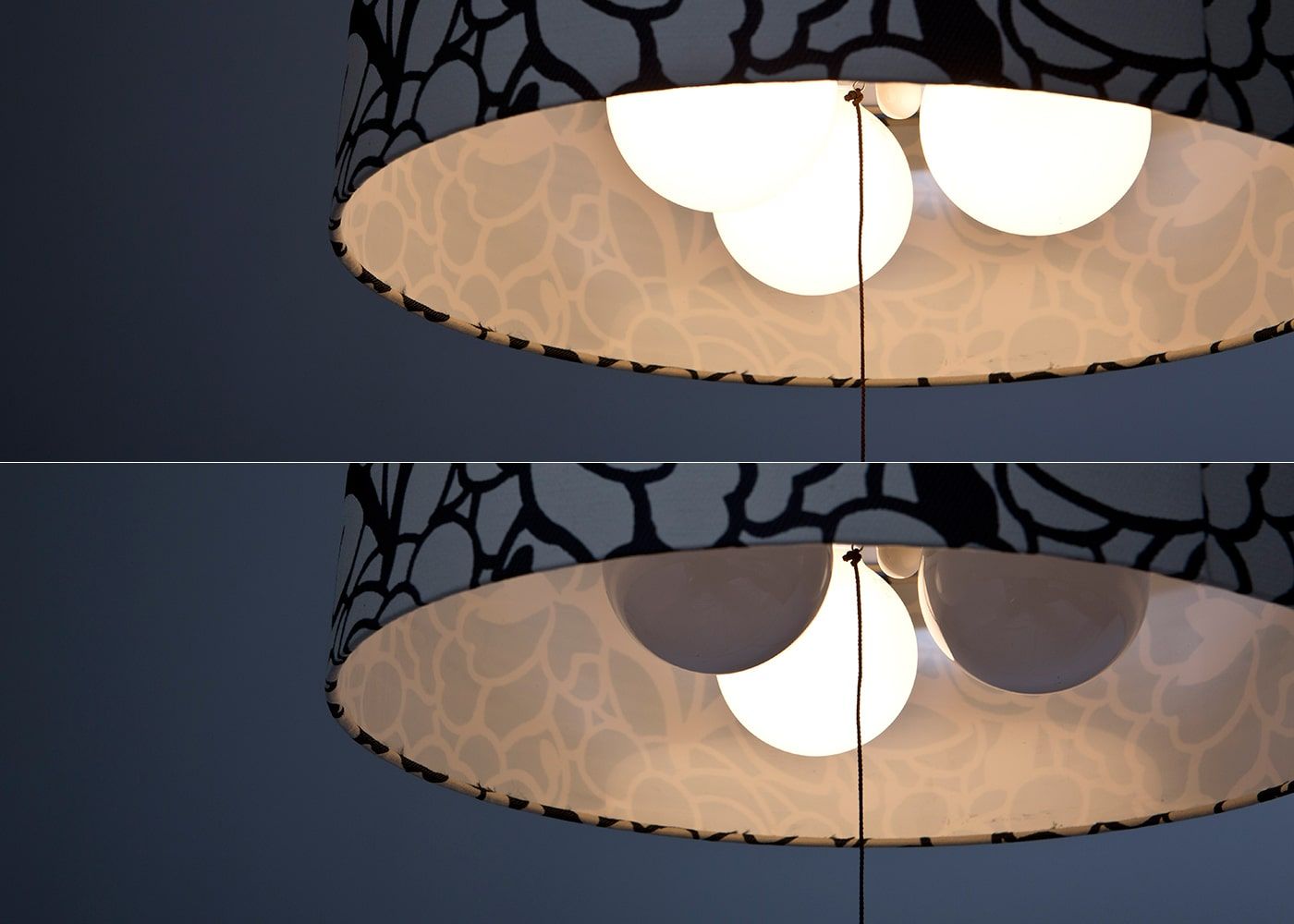 写真上:3灯ON、写真下:1灯ON。電球1灯あたり100Wで最大300Wの明るさです。主照明として十分な明るさを確保しました。常夜灯も1個付属されています。