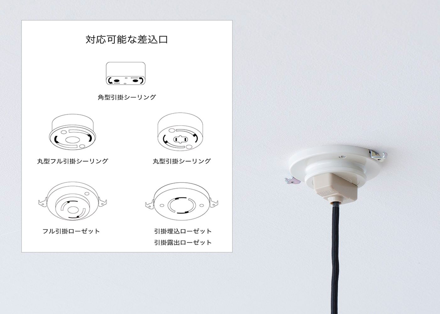 電源プラグは一般のご家庭で使われるシーリング仕様で、図のいずれかの差込口が付いていれば簡単に取り付け可能です。