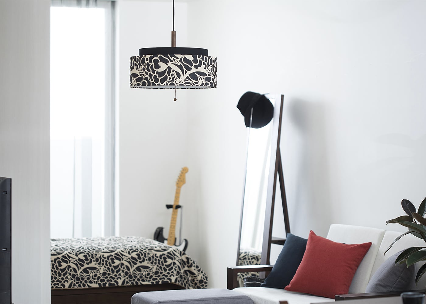 モノトーン中心にコーディネートされた一人暮らし(1LDK)の空間にも、コスイの花柄がアクセントとして効いています。同シリーズの