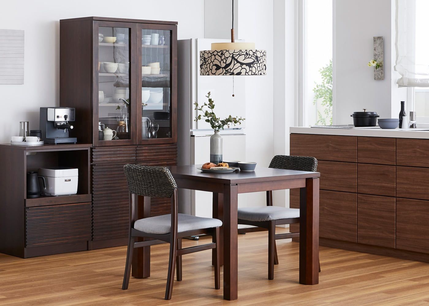 ダイニングテーブルセットを中心としたシックな空間に、コスイ・ペンダントライトが映えています。食卓に高級感や洗練感を与えて、ワンランク上のダイニングを演出できます。(写真はKSブラック)