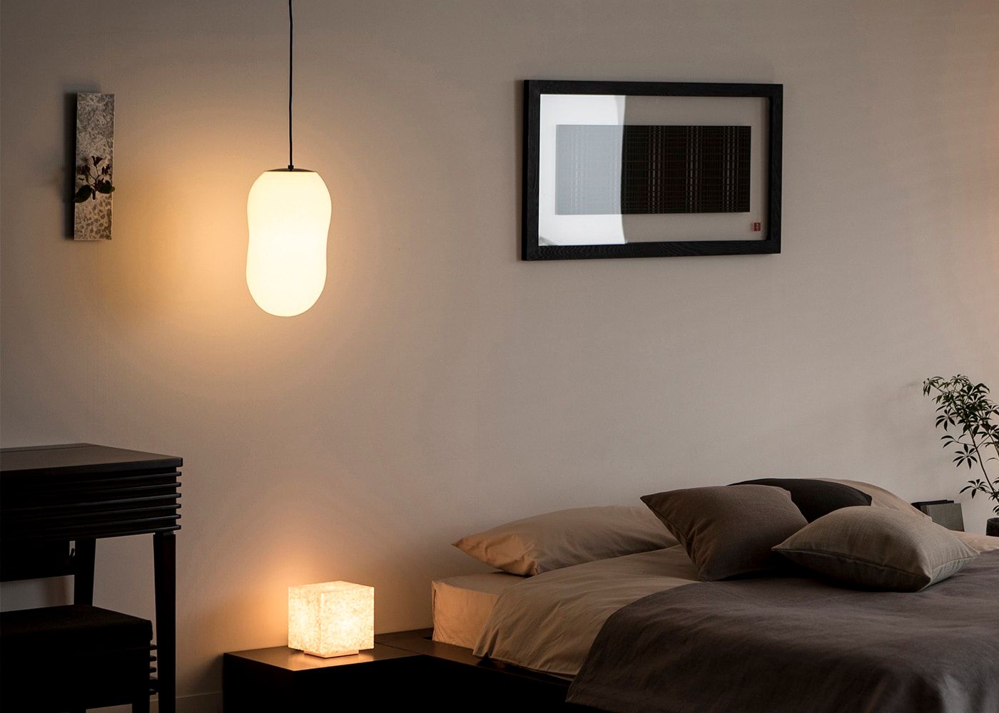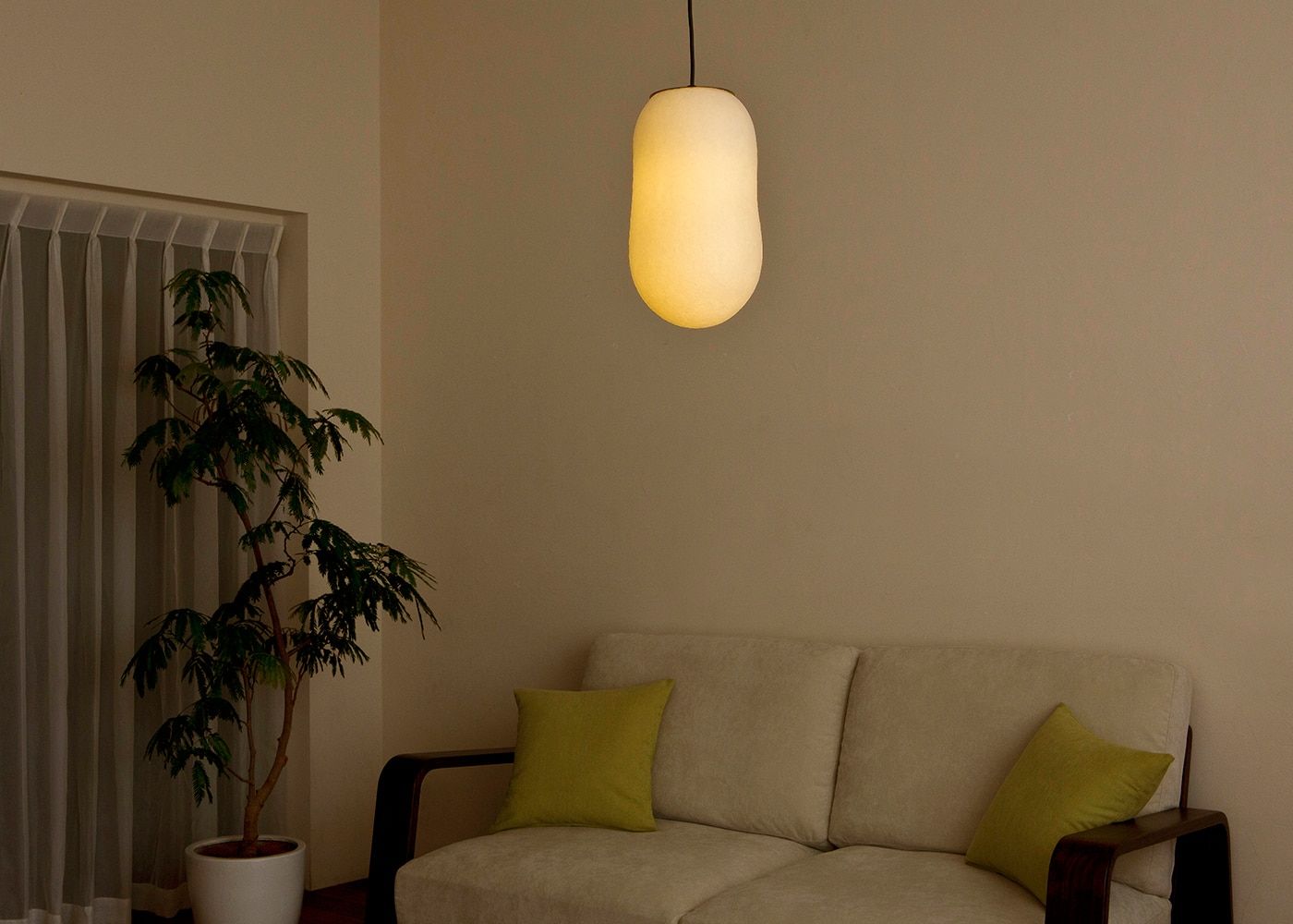 照明を灯していない時でも、繭のような優しい形がさりげないアクセントになります。寝室のような限られた空間でも、コーディネートしやすいコンパクトなサイズ感も魅力です。