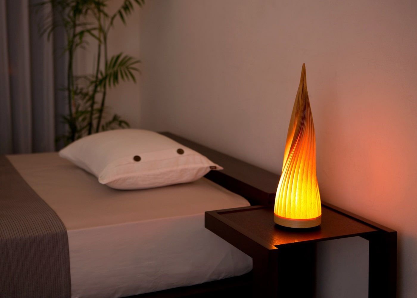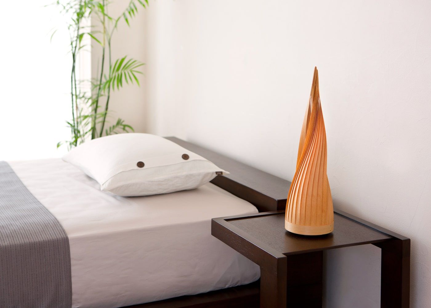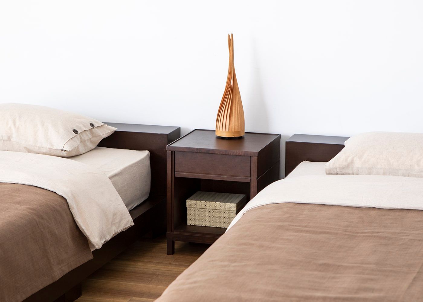 ツインベッドの間にサイドテーブルを配置して、komorebi tsi-1 を灯せば高級旅館のような寝室づくりもできます。ブナ材から漏れる温かい光が、お休み前のひと時を心地よい気持ちに変えてくれるでしょう。