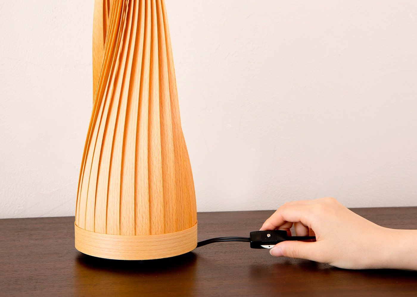 天然ブナ材のシェードからやさしい光を灯すkomorebi tsi-1。スライスしたブナを透過して放たれる光は温かく、木肌の隙間から覗くようにやさしく洩れてくる光はまるで木漏れ日のようです。