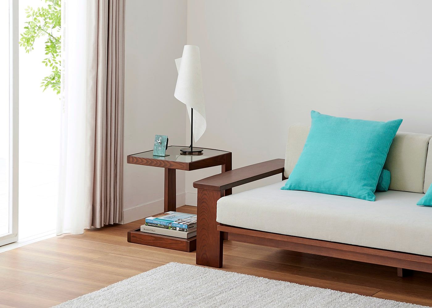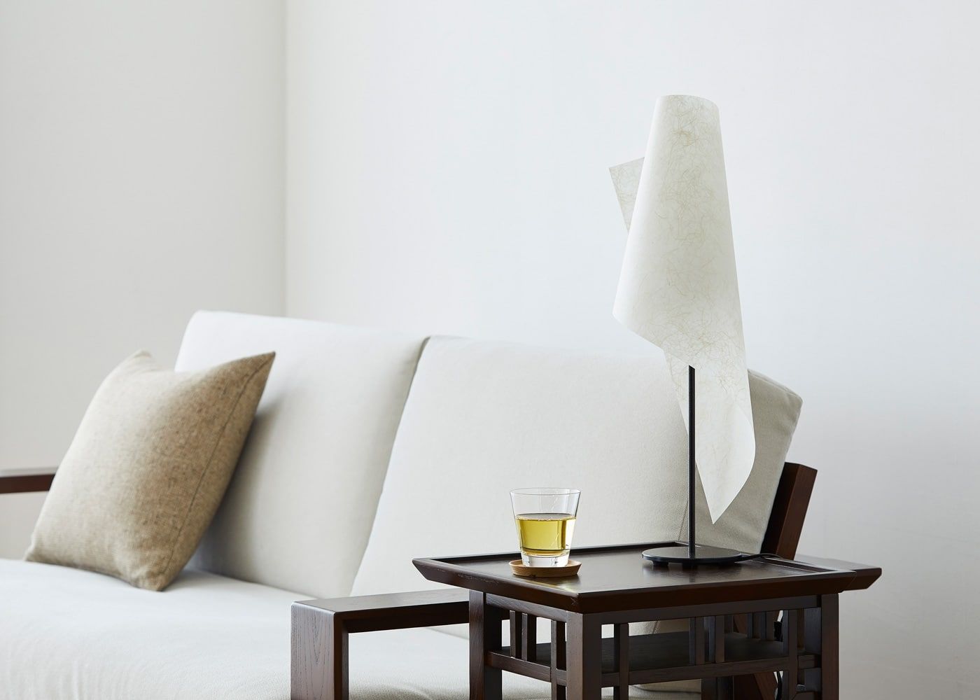 テーブルランプの中でも高さがあるデザインのため、ロースタイルの寝室に添えることでフォーカルポイントを作れます。オブジェのようにも演出できるのがtsubakuro tsi-1の魅力と言えます。(写真は