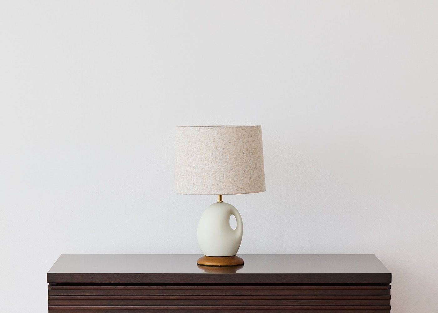 卵のようなやさしいフォルムが見る人の心を惹くセラ・テーブルランプ。滑らかな質感の磁器とウッドベース、素材感のあるシェードという異素材の組み合わせが唯一無二の照明です。置くだけで空間にアクセントをあたえてくれます。