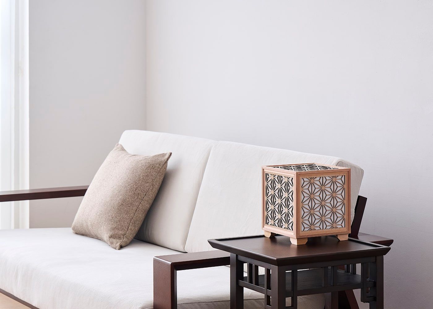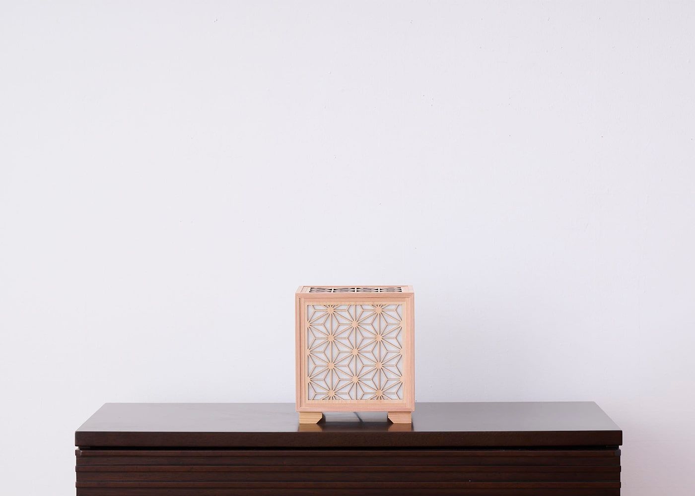 日本の伝統的な組子模様を彫刻したフレームに和紙を組み合わせたkumiko cube (和紙)。淡くほのかに灯る光は、和紙ならではの趣を漂わせ、落ち着いた雰囲気を演出します。