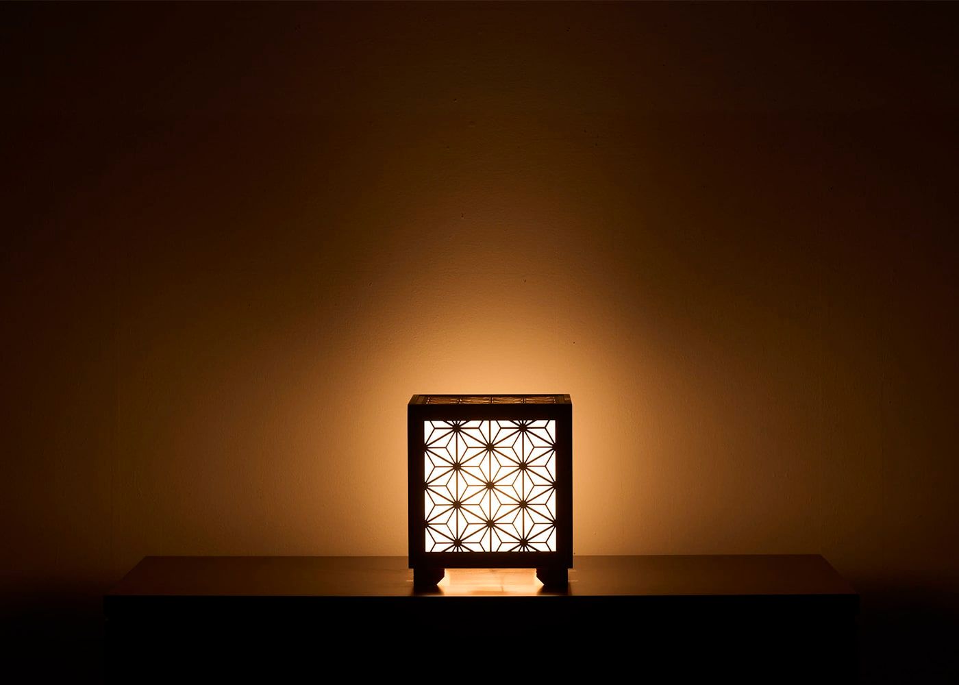 やわらかな明るさが和紙越しに広がり、組子の線がくっきりと浮かび上がります。光と影の重なりが穏やかな深みを生み、そばに置くだけで落ち着いた雰囲気が整う灯りです。