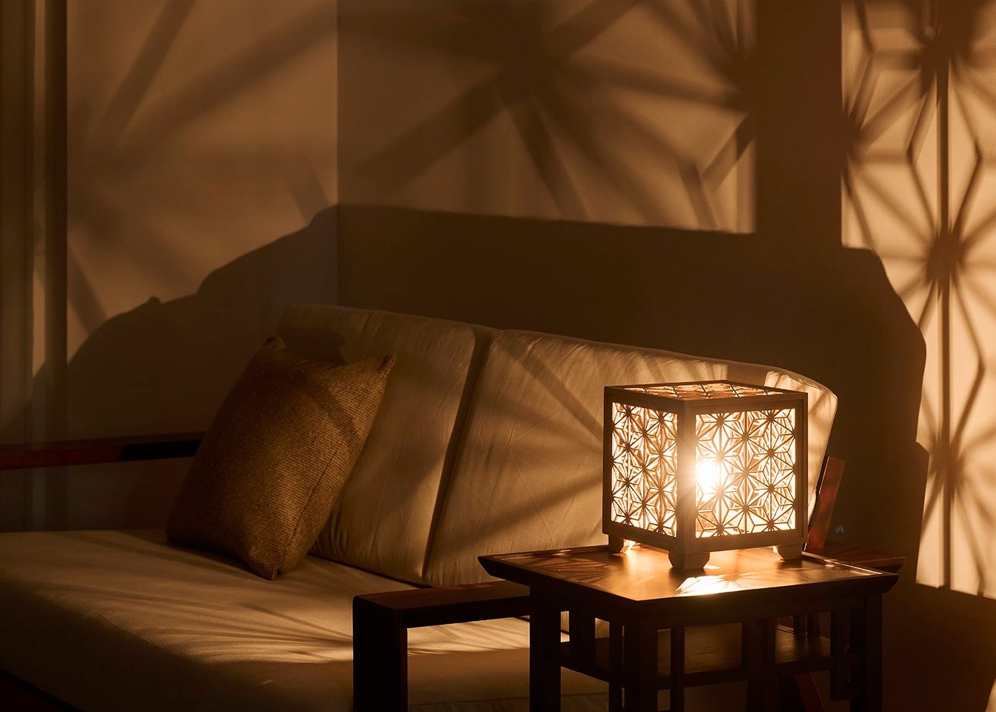 灯りがともると、組子模様が影として浮かび上がり、濃淡が重なって強い立体感が生まれます。模様の重なりが奥へ続くように感じられ、落ち着いた陰影が空間に静けさを添えます。