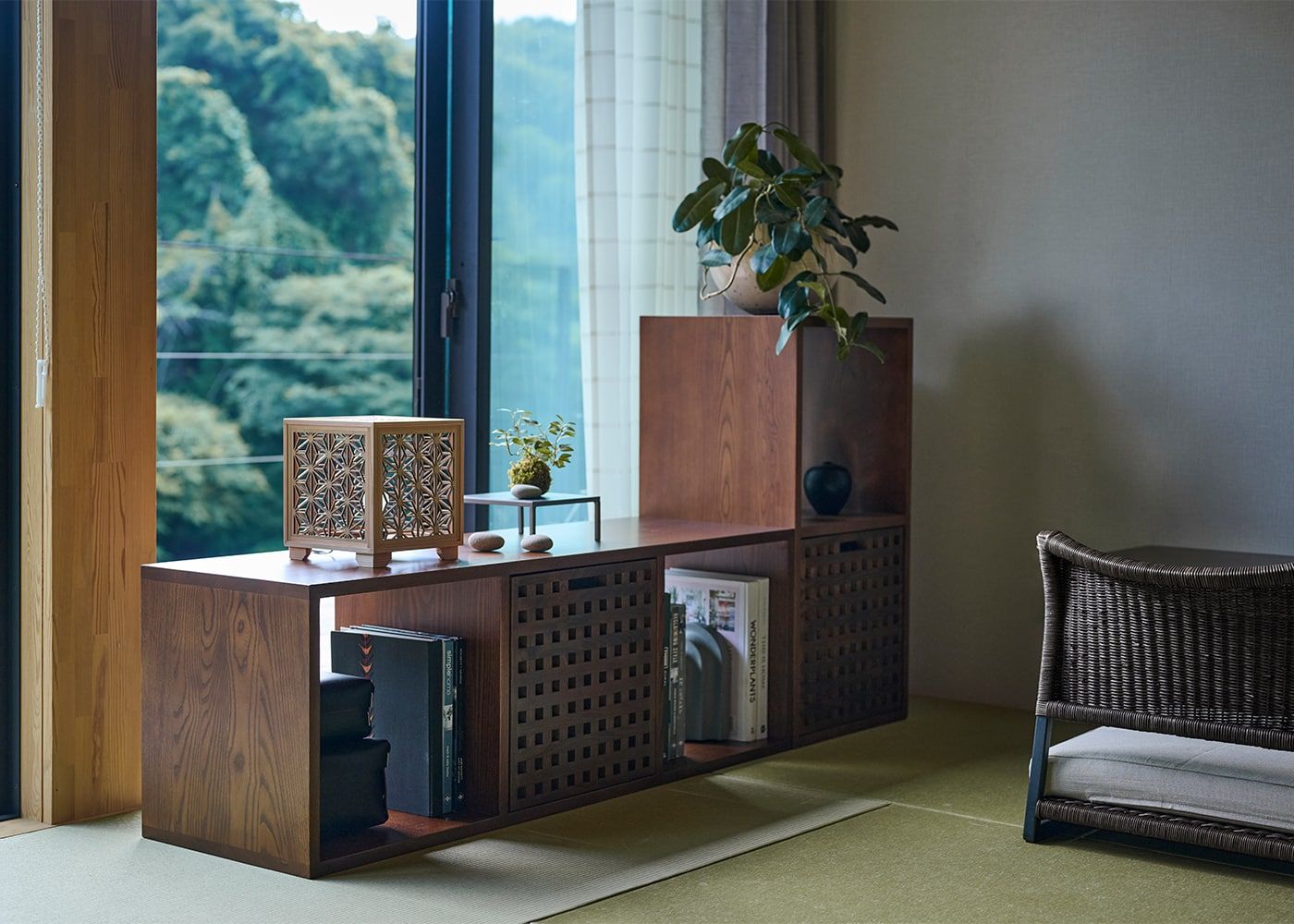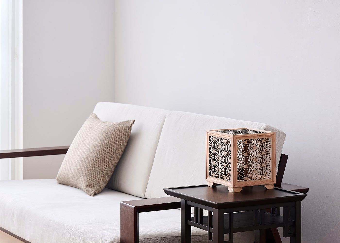 低い位置に配置したkumiko cubeは、視線を床の近くに導き、空間全体に安心感を与えます。組子模様がアクセントとなり、和の趣を感じるお部屋作りが実現します。