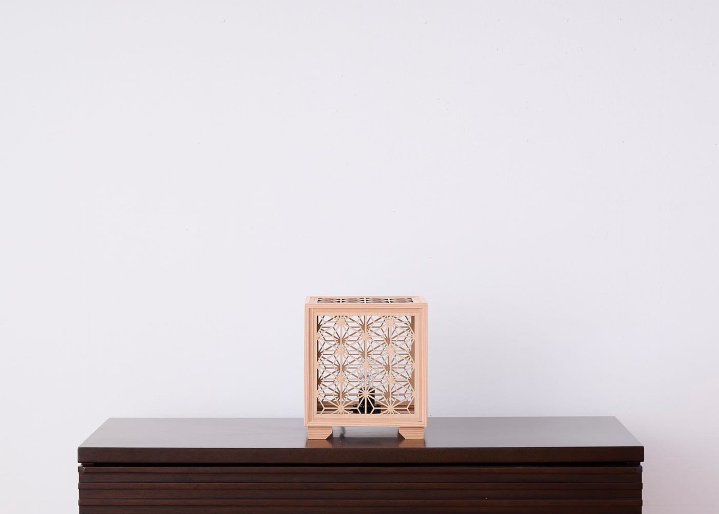日本の伝統的な組子模様を彫刻したシェードから、幻想的な影が伸びるkumiko cube。壁面には絵のように繊細な模様が映ります。灯すだけで空間に深い表情が生まれ、そっと置くだけで心ほどける特別なひとときを味わえます。