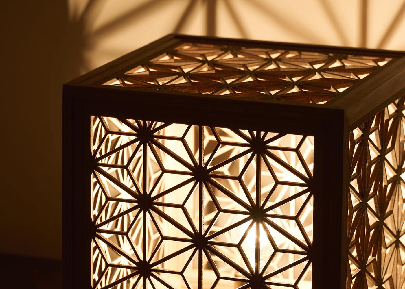 シェードにはレーザー彫刻加工を施し、伝統的な組子の意匠を全面にあしらっています。等間隔に続く形が静かなリズムをつくり、木の素朴な色合いが端正な表情を引き立てます。